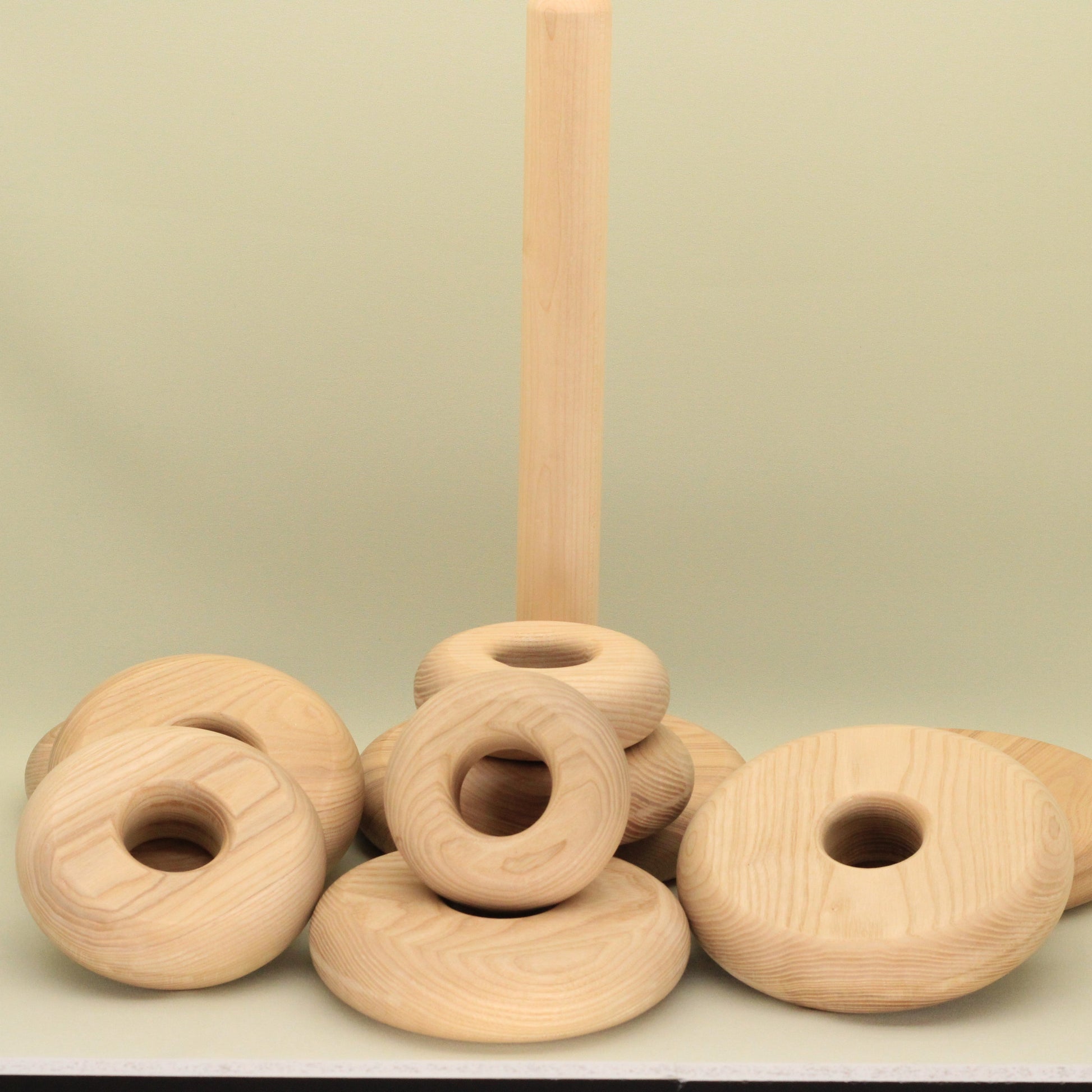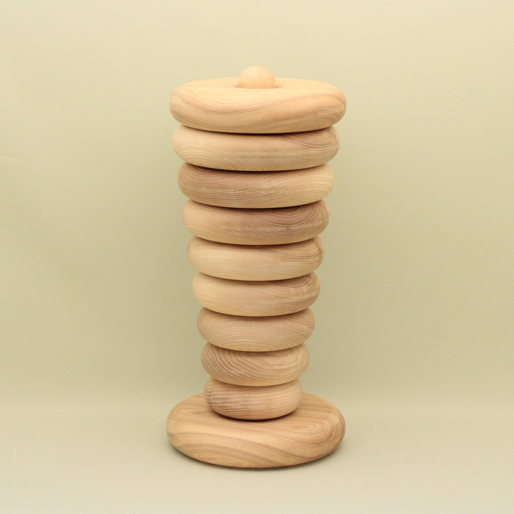 • 10 Intriguing Parts: This set includes 10 finely crafted wooden pieces, including a substantial 20 cm base and nine smaller rings. These wooden rings can be stacked in various ways, creating a mesmerizing pyramid that enhances fine motor skills and spatial awareness.