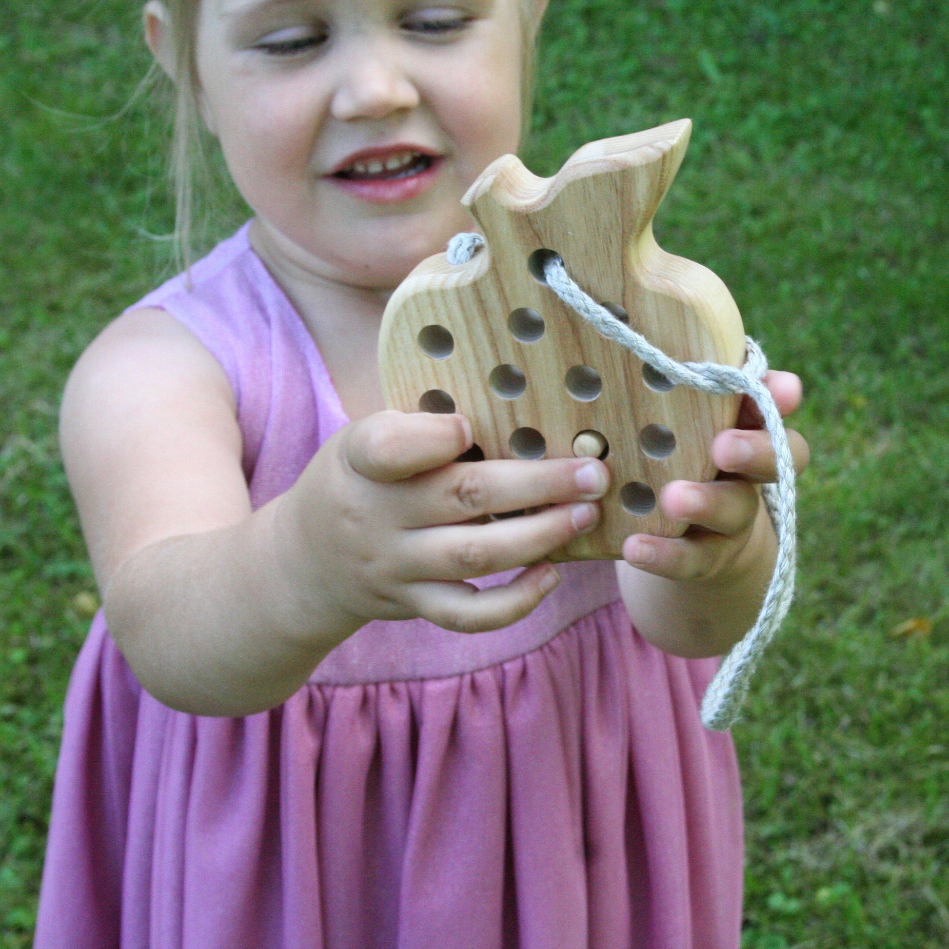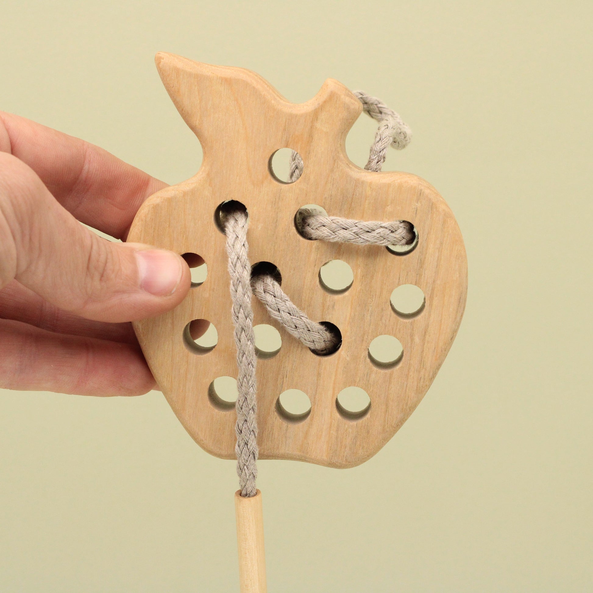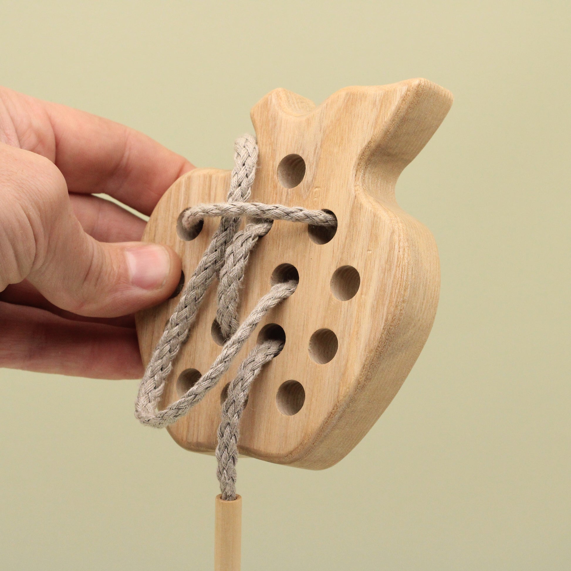 Engage your child's imagination as they explore the world of threading and lacing with this charming wooden toy. The carefully carved details and smooth, natural wood provide a tactile experience that stimulates sensory development.