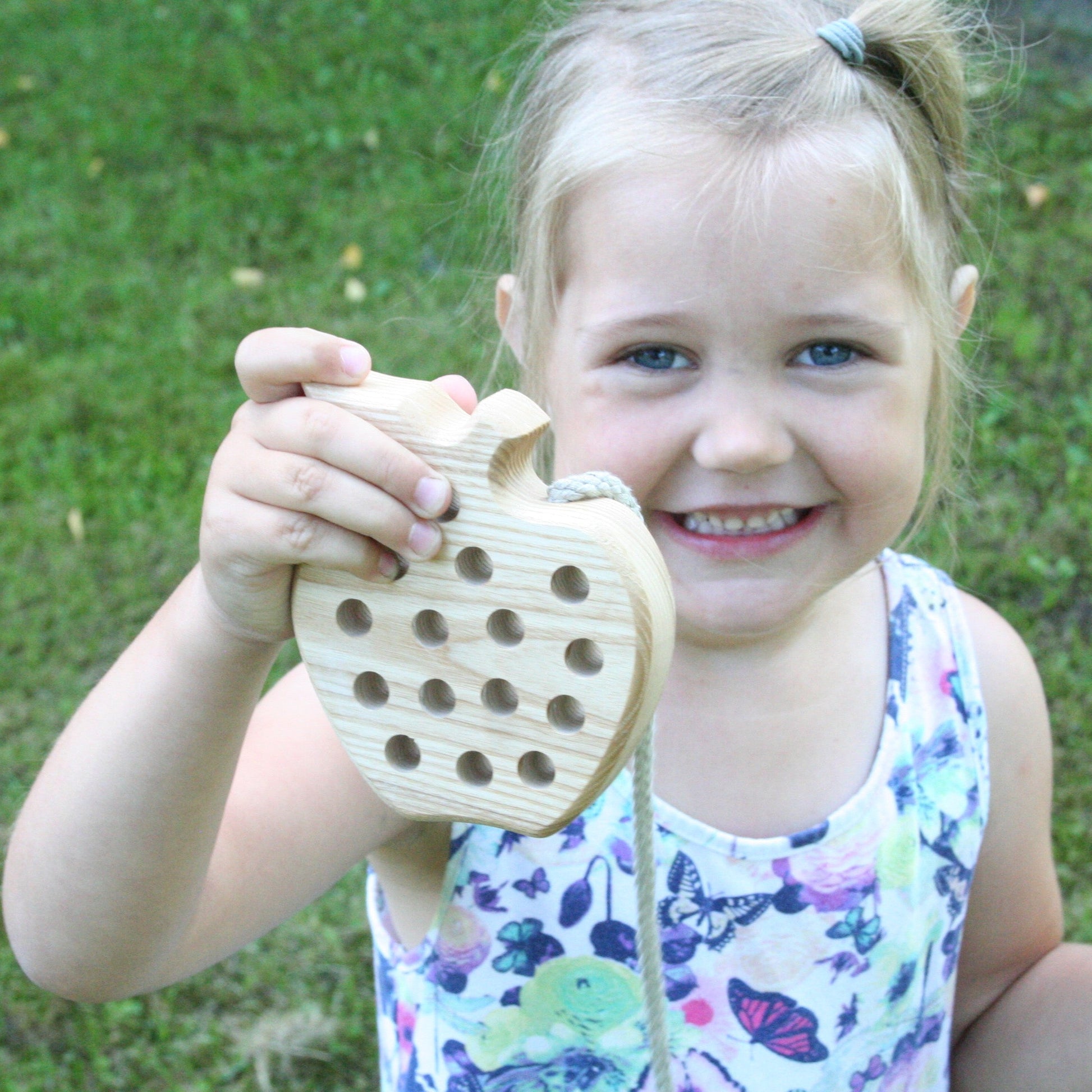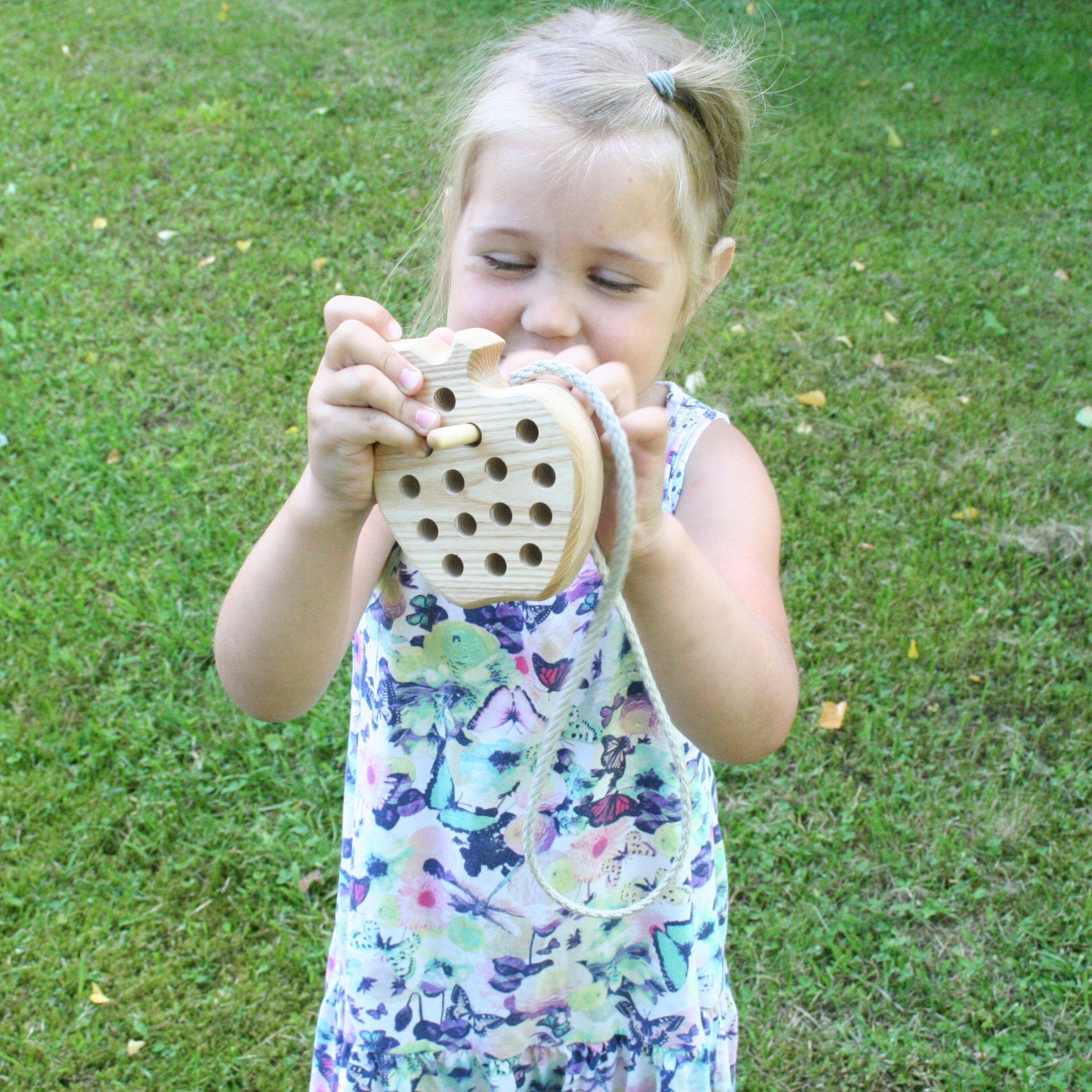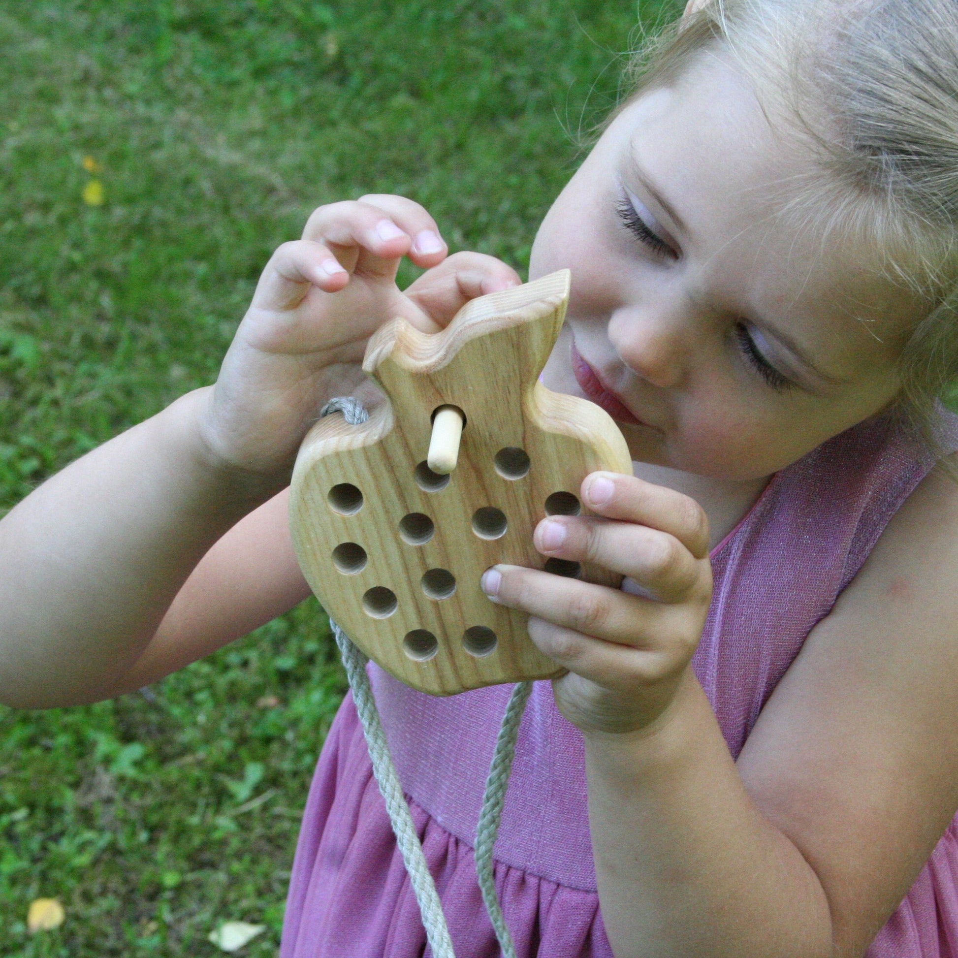 Engage your child's imagination as they explore the world of threading and lacing with this charming wooden toy. The carefully carved details and smooth, natural wood provide a tactile experience that stimulates sensory development.