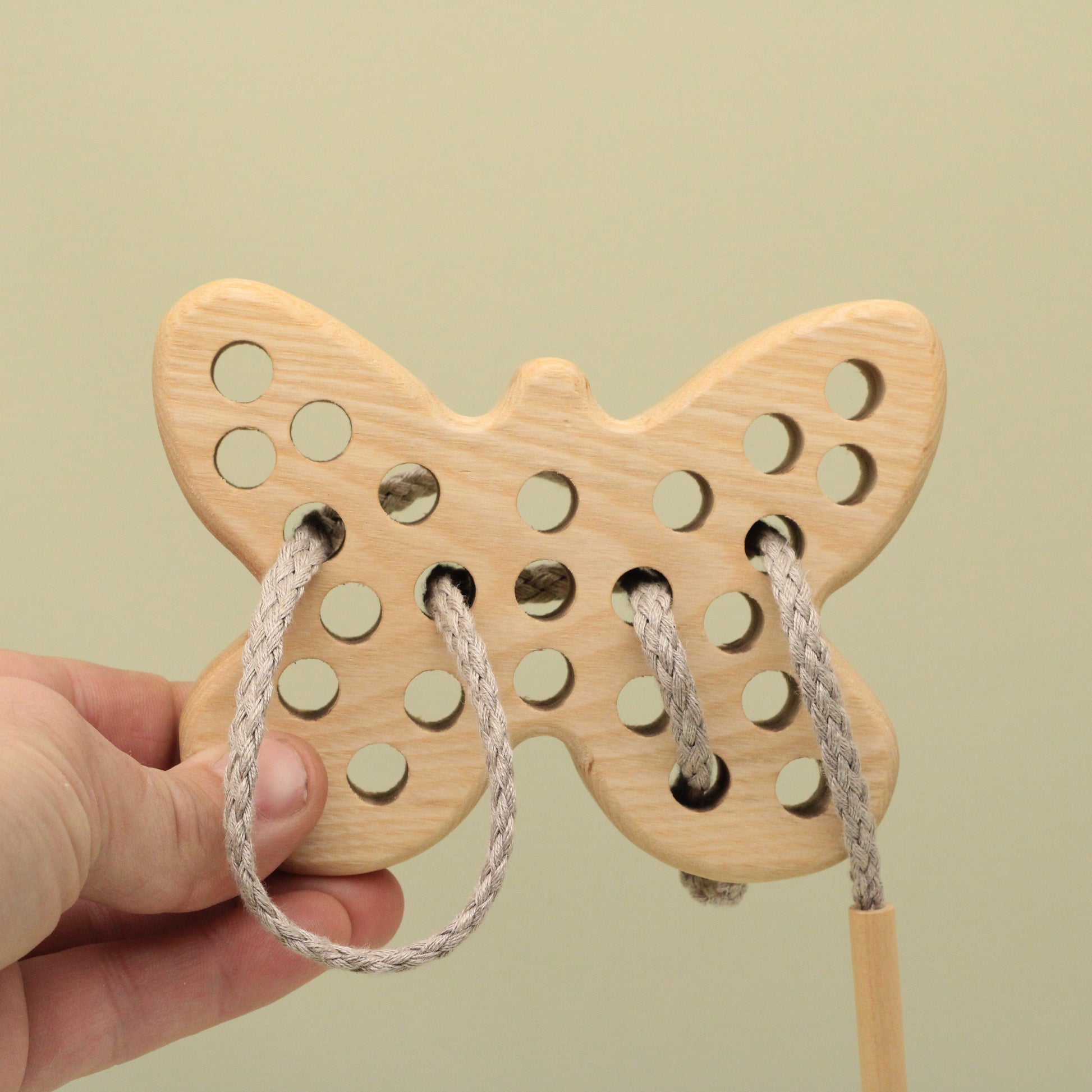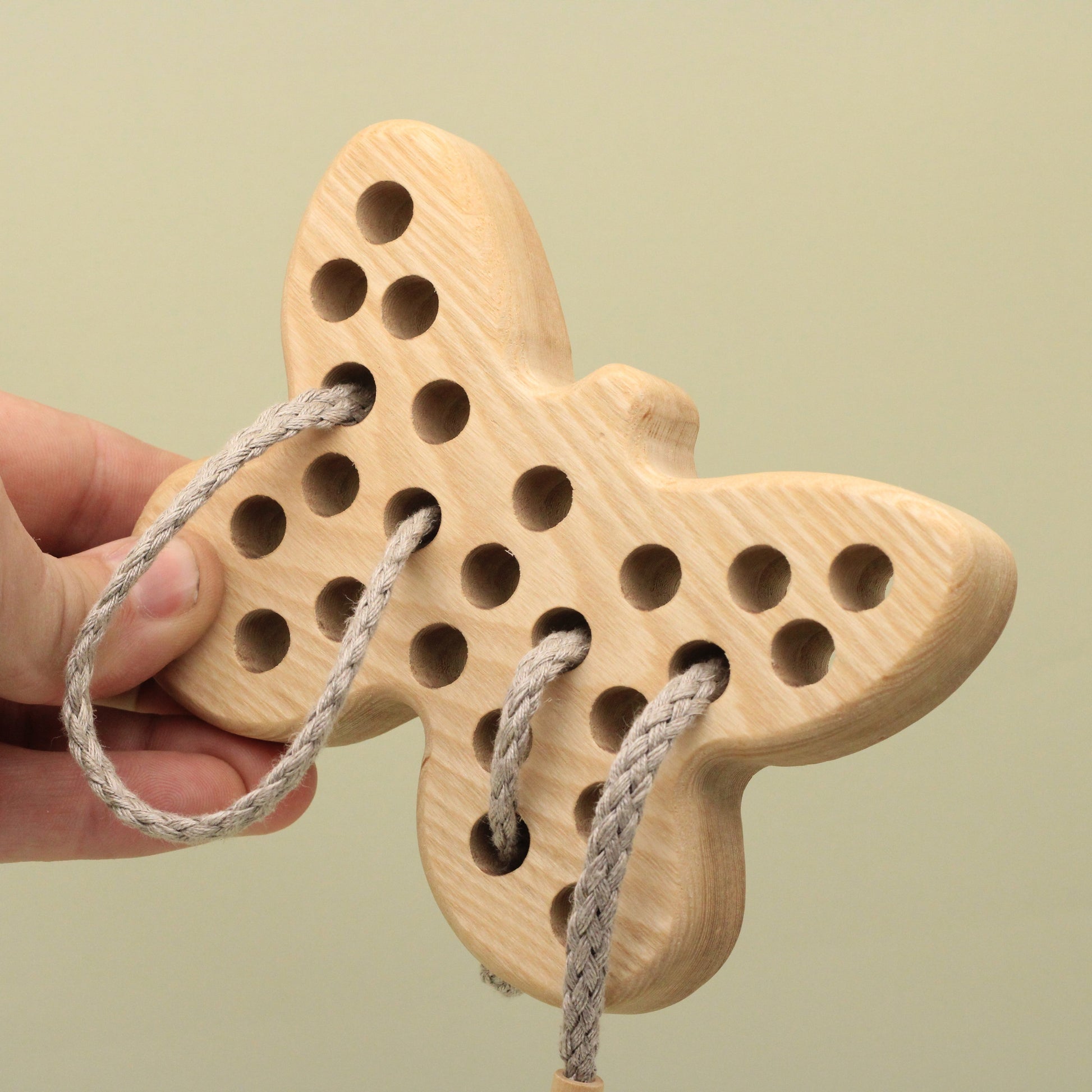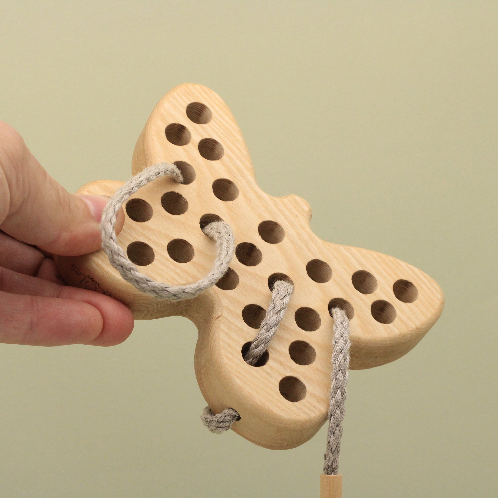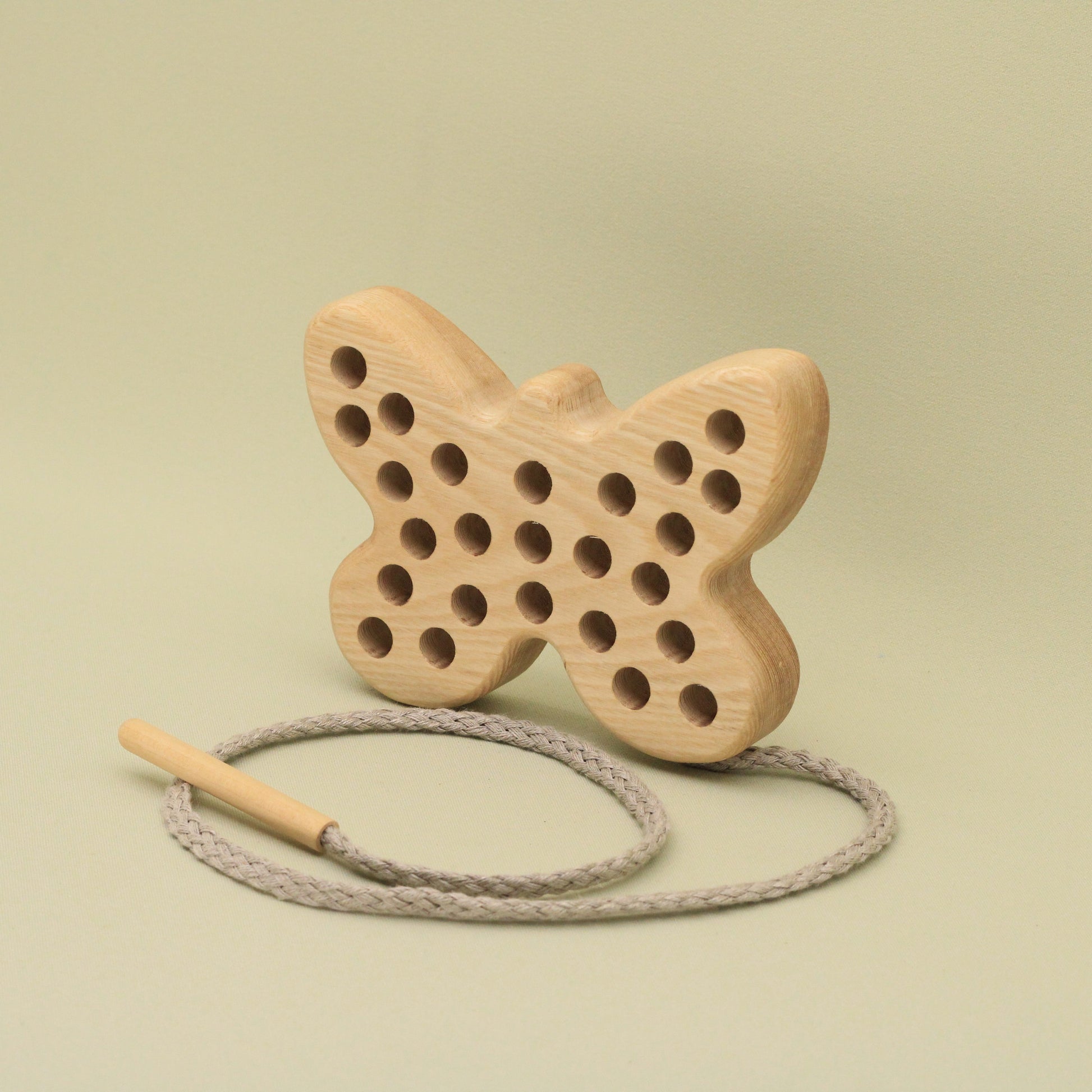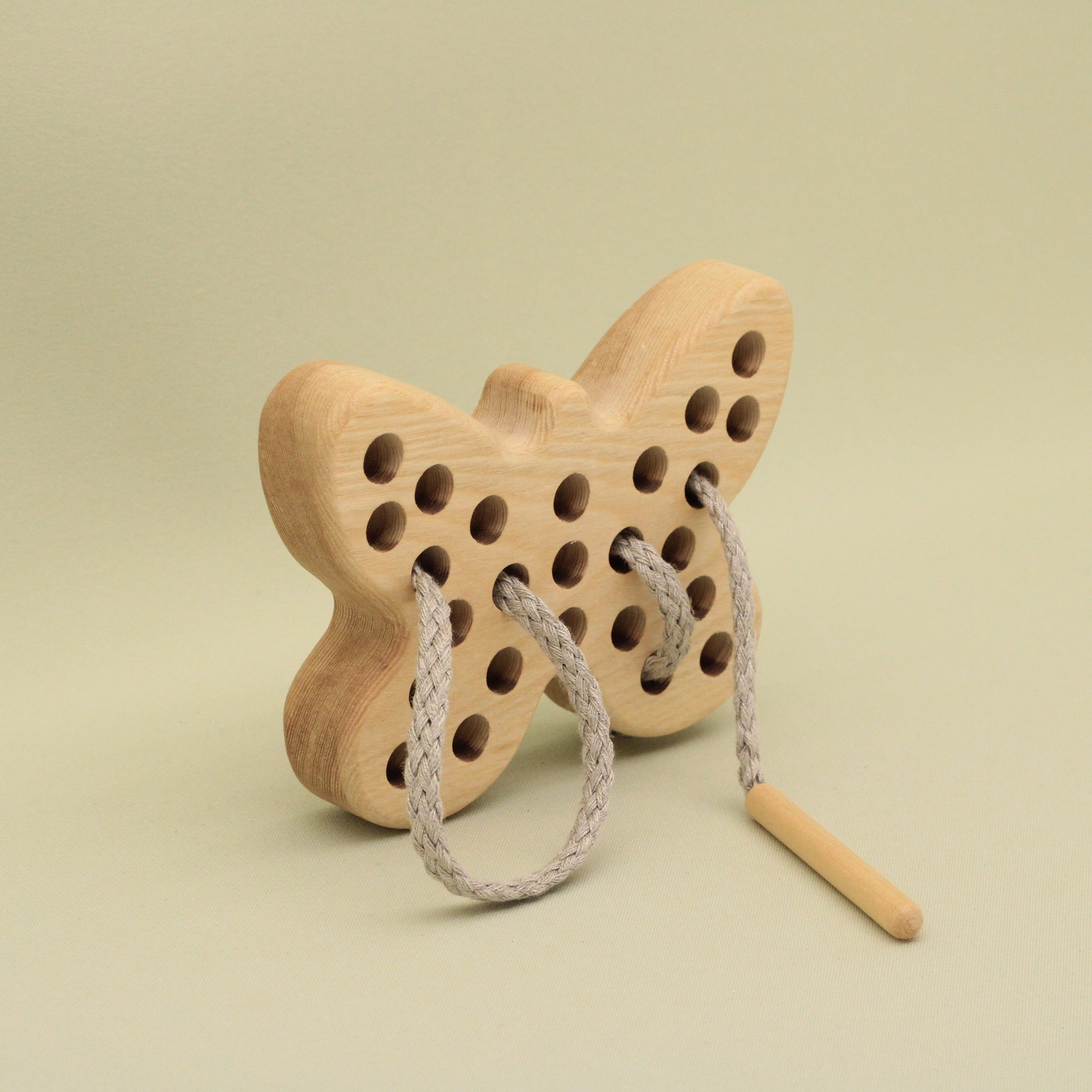 Engage your child's imagination as they explore the world of threading and lacing with this charming and natural toy. The carefully carved details and smooth, natural wood provide a tactile experience that stimulates sensory development.