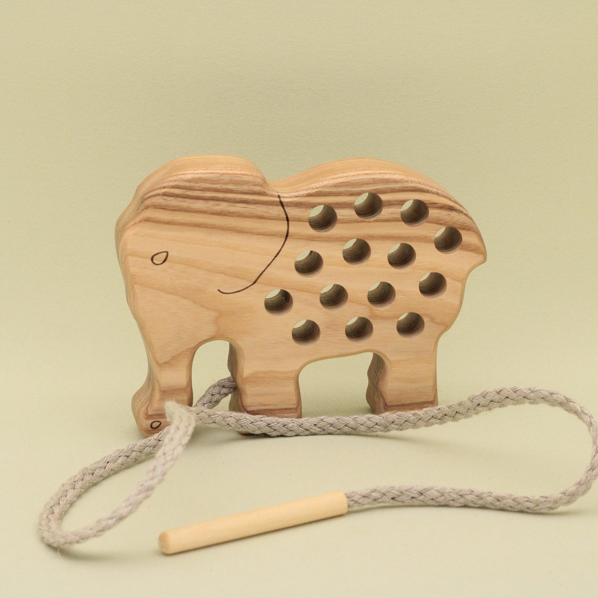 Engage your child's imagination as they explore the world of threading and lacing with this charming wooden toy. The carefully carved details and smooth, natural wood provide a tactile experience that stimulates sensory development.