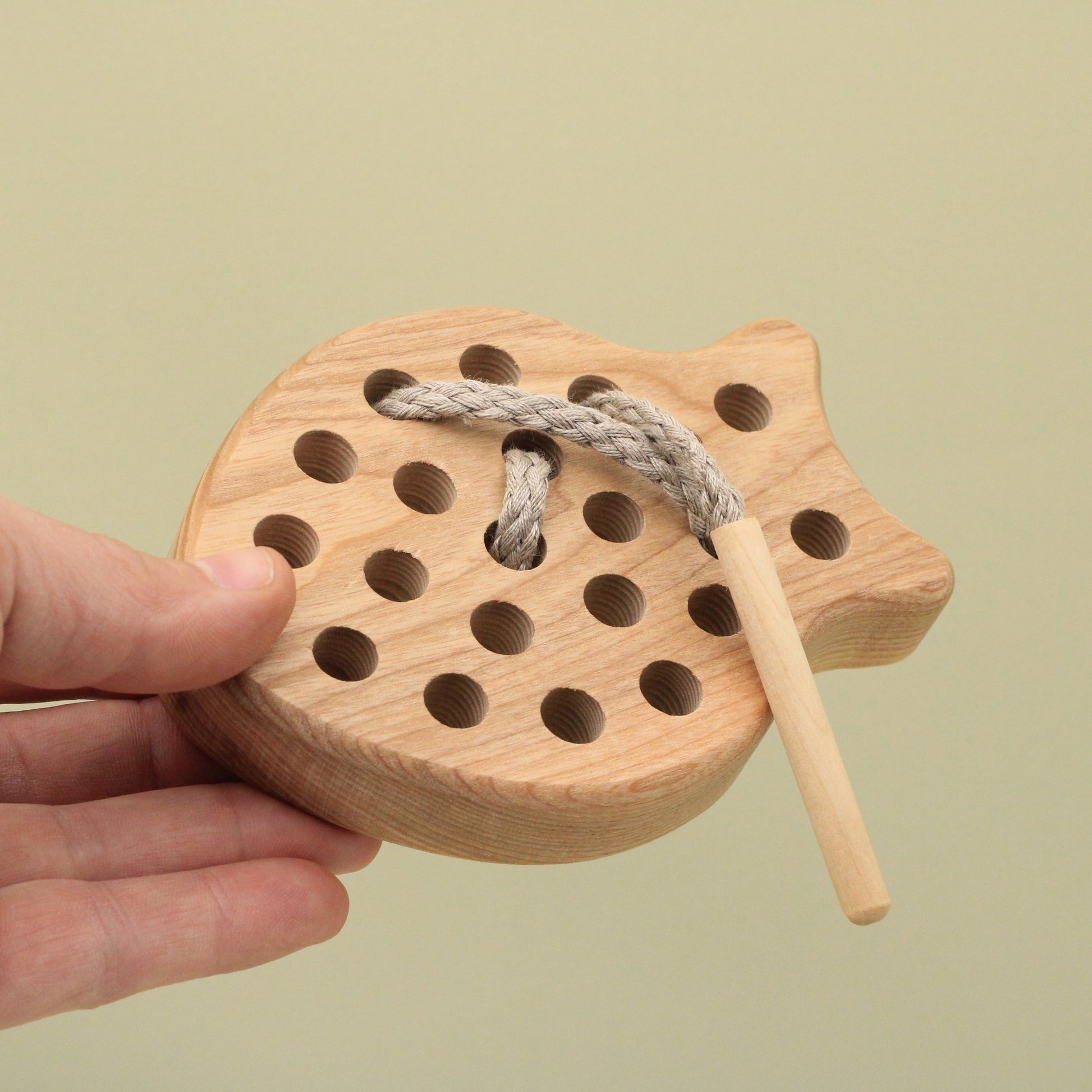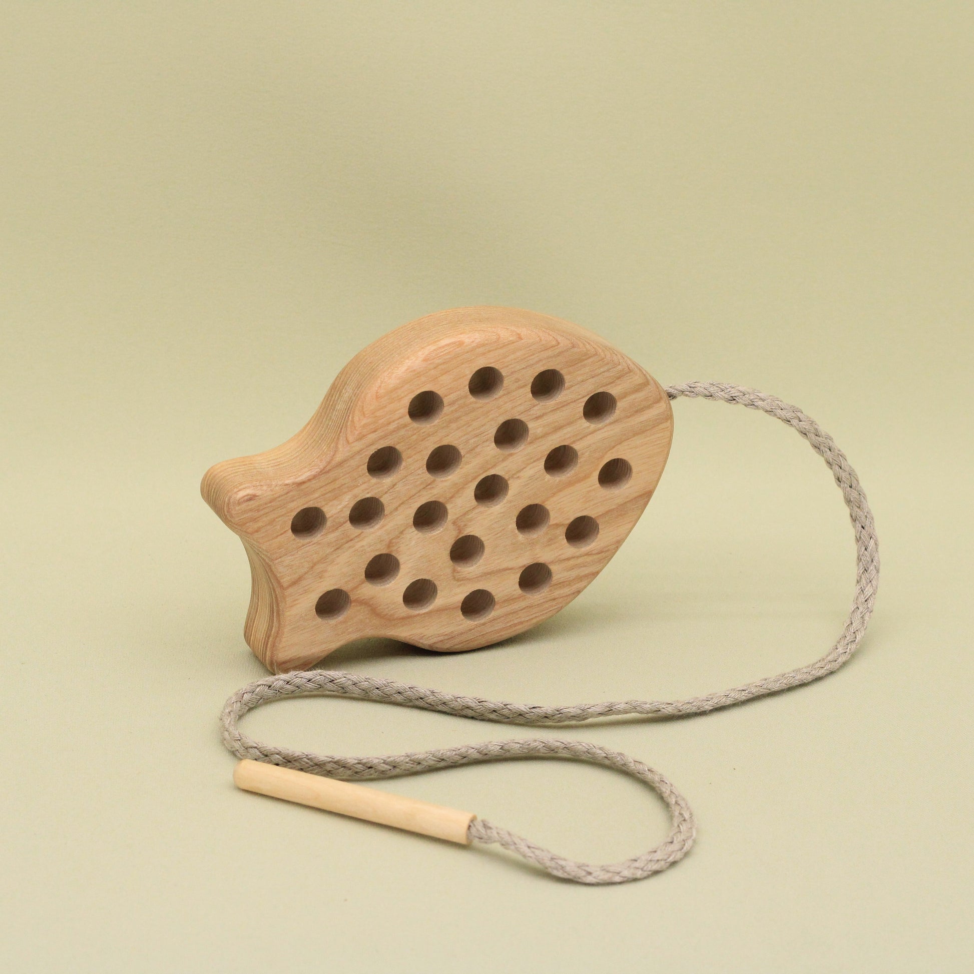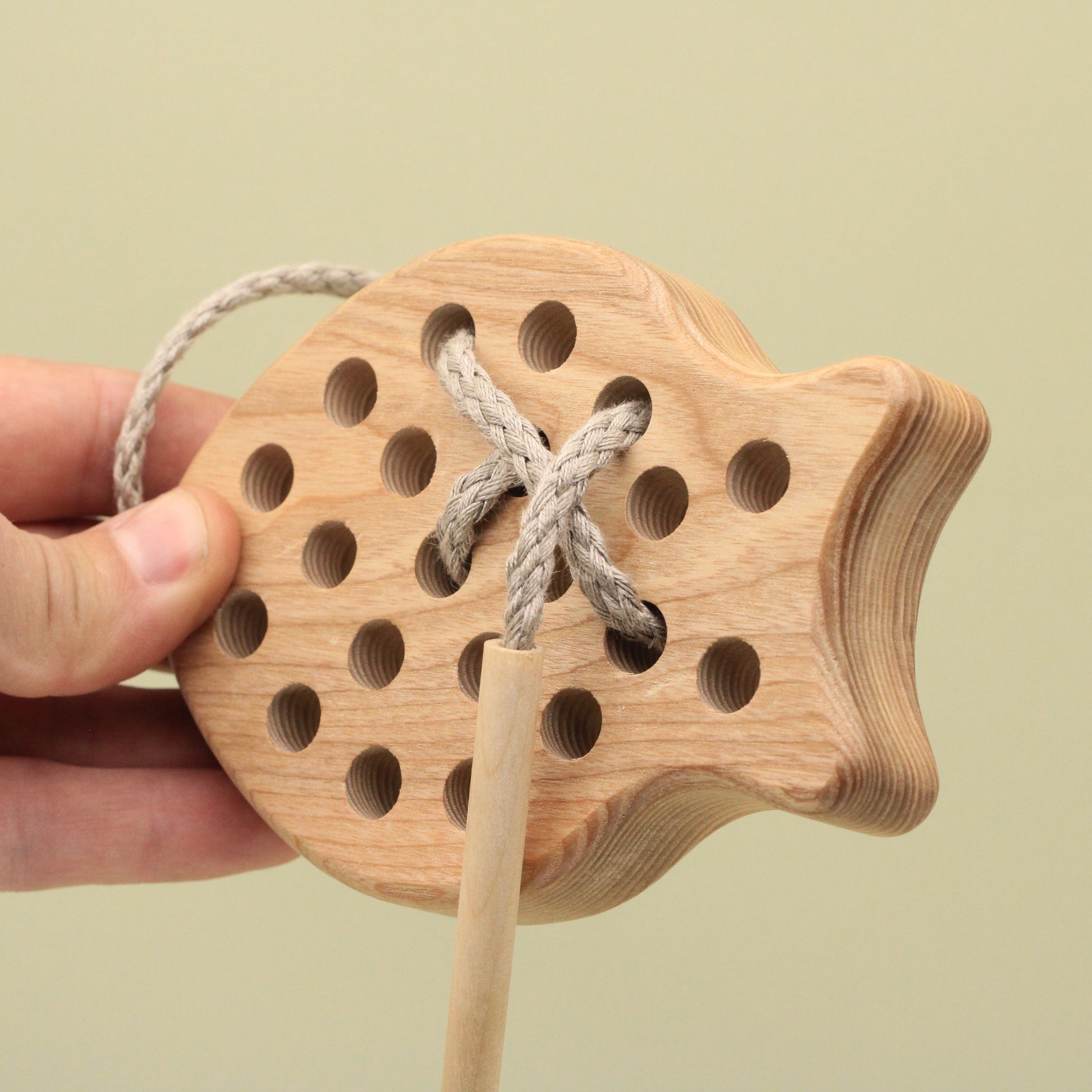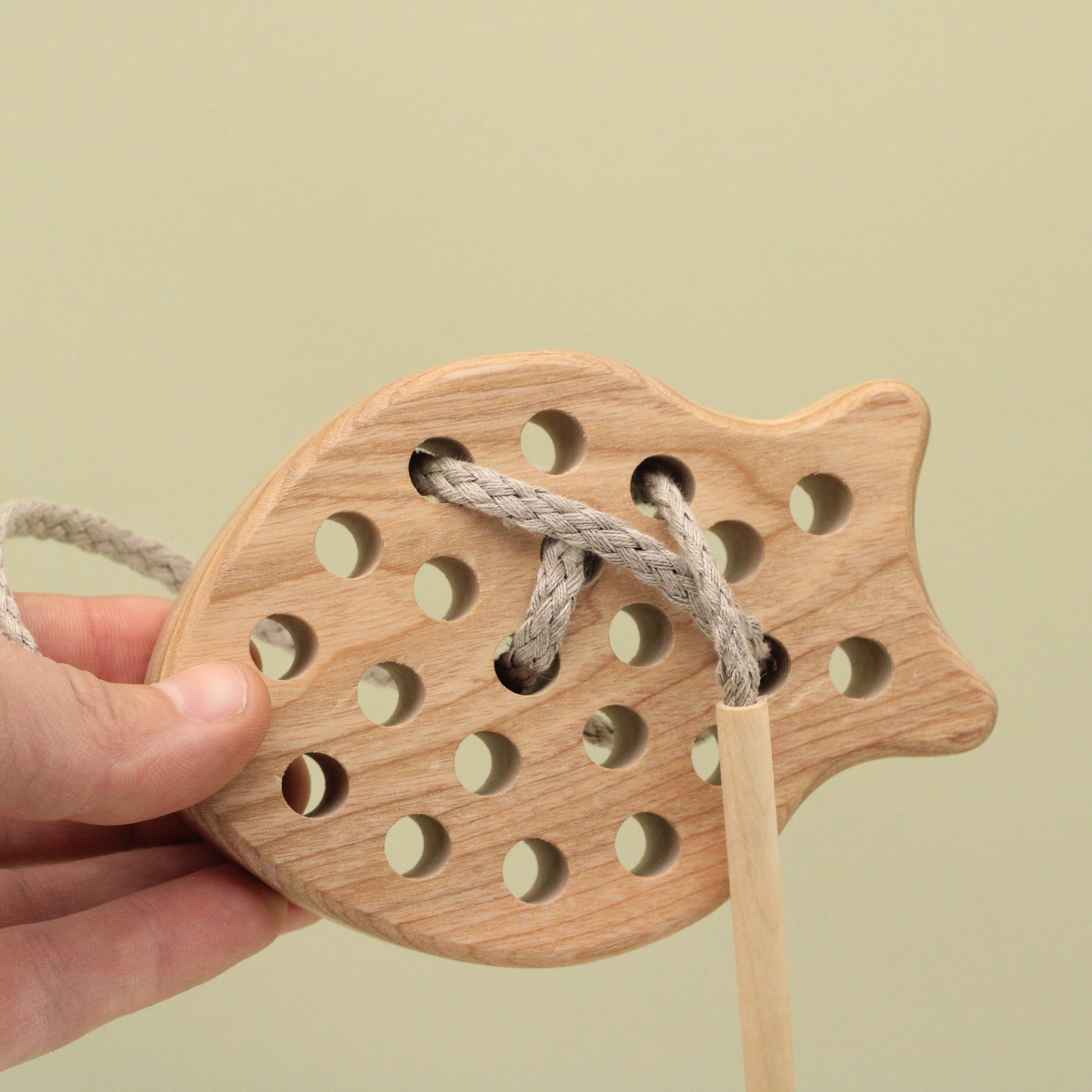Engage your child's imagination as they explore the world of threading and lacing with this charming wooden toy fish. The carefully carved details and smooth, natural wood in our organic wooden toys provide a tactile experience that stimulates sensory development.
