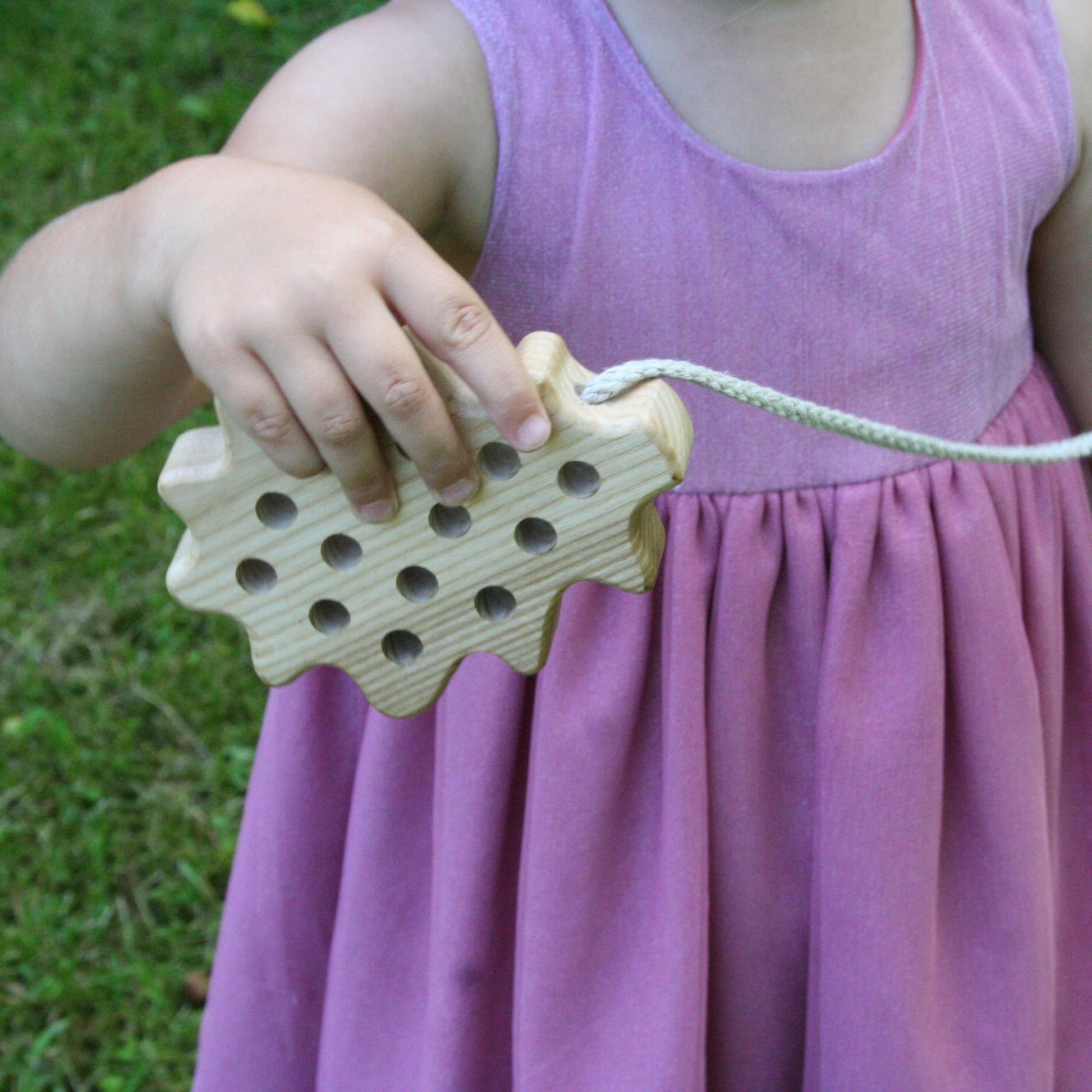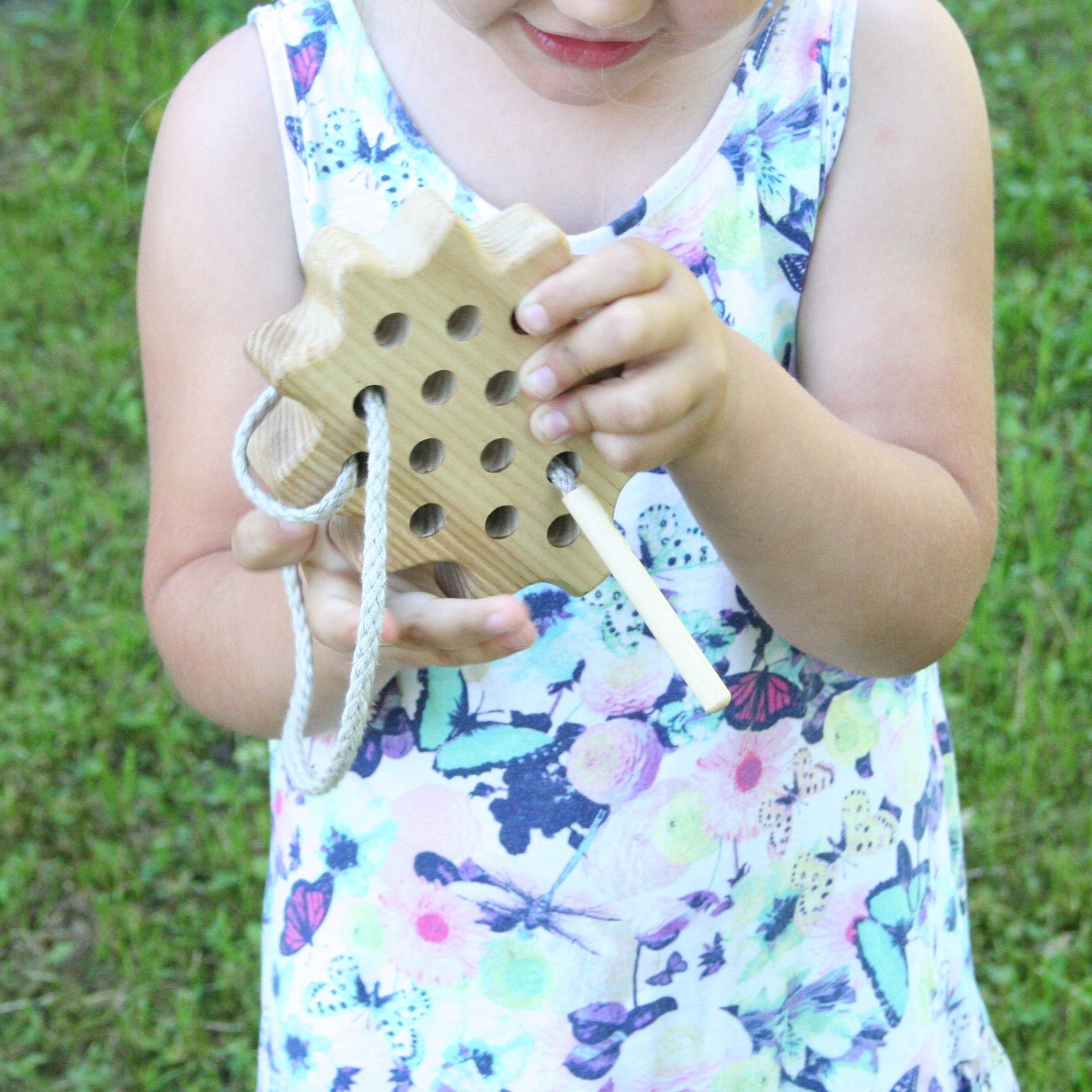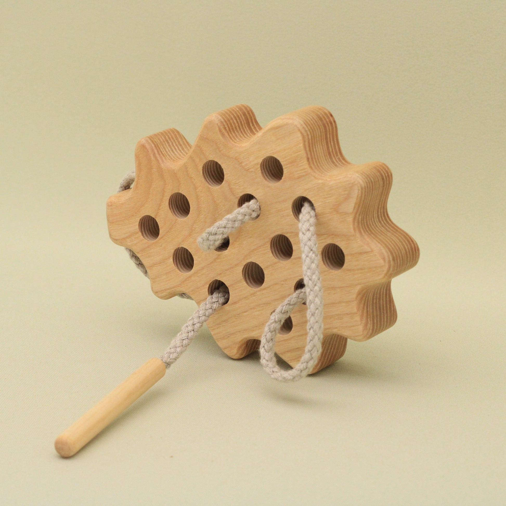 Engage your child's imagination as they explore the world of threading and lacing with this charming and sustainable toy. The carefully carved details and smooth, natural wood provide a tactile experience that stimulates sensory development.