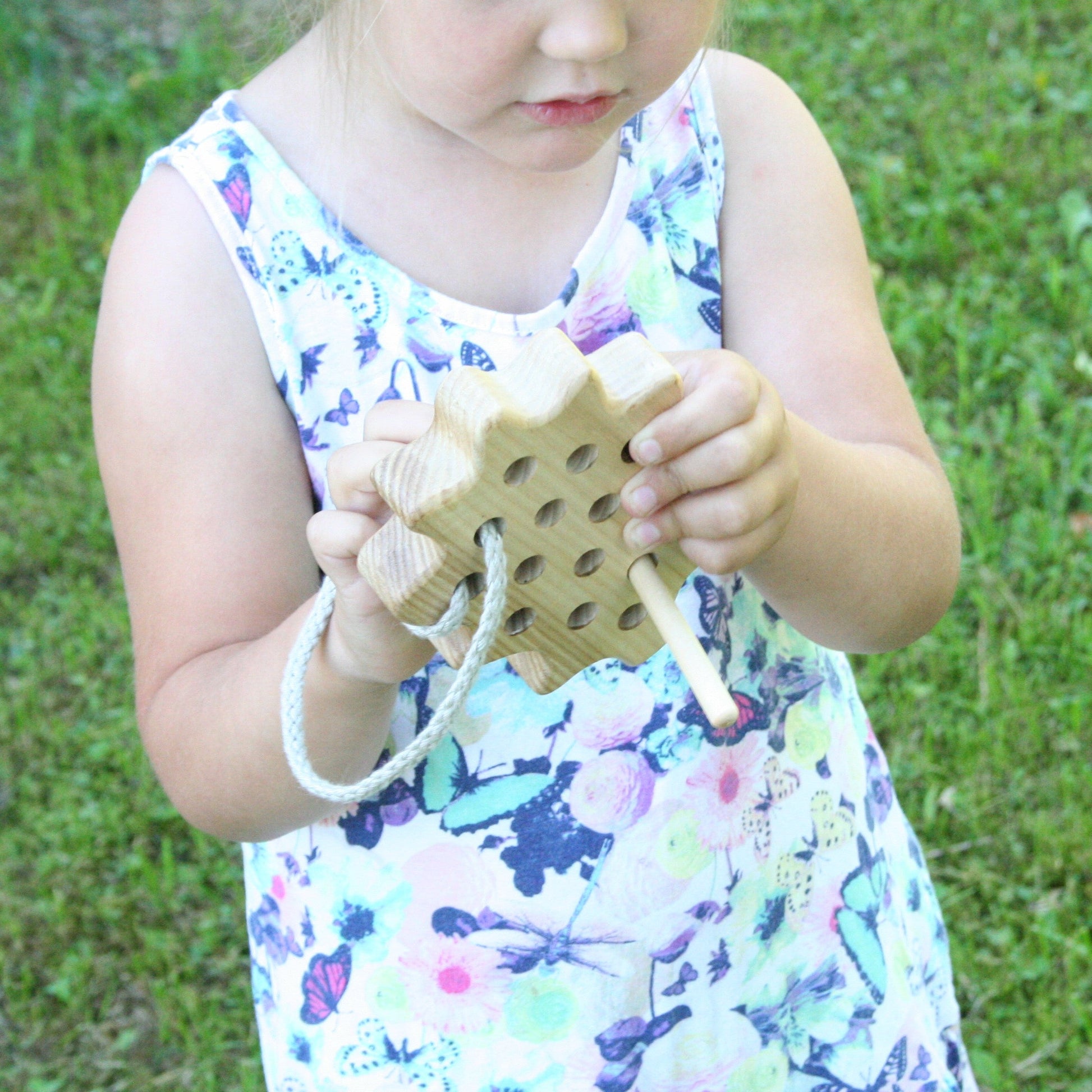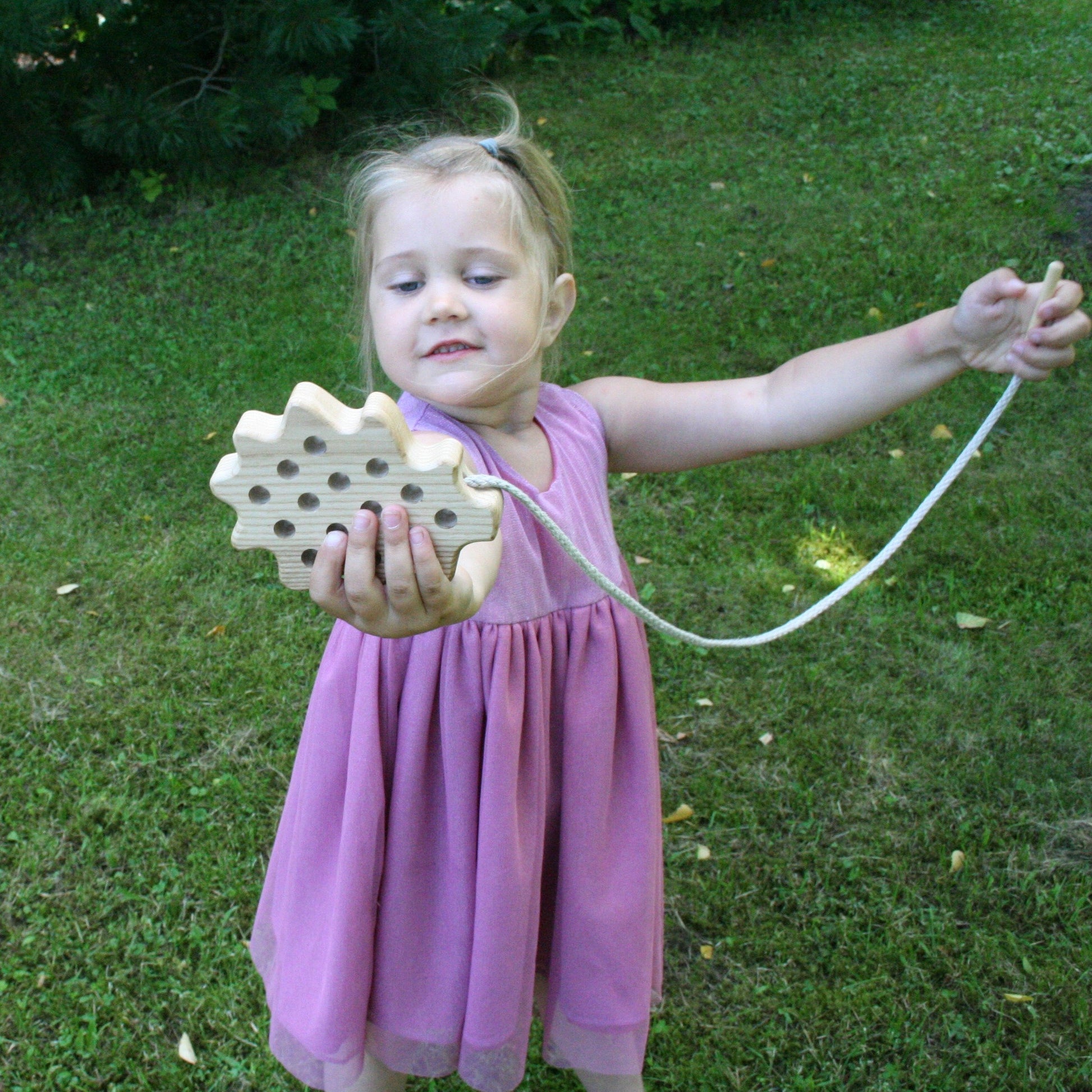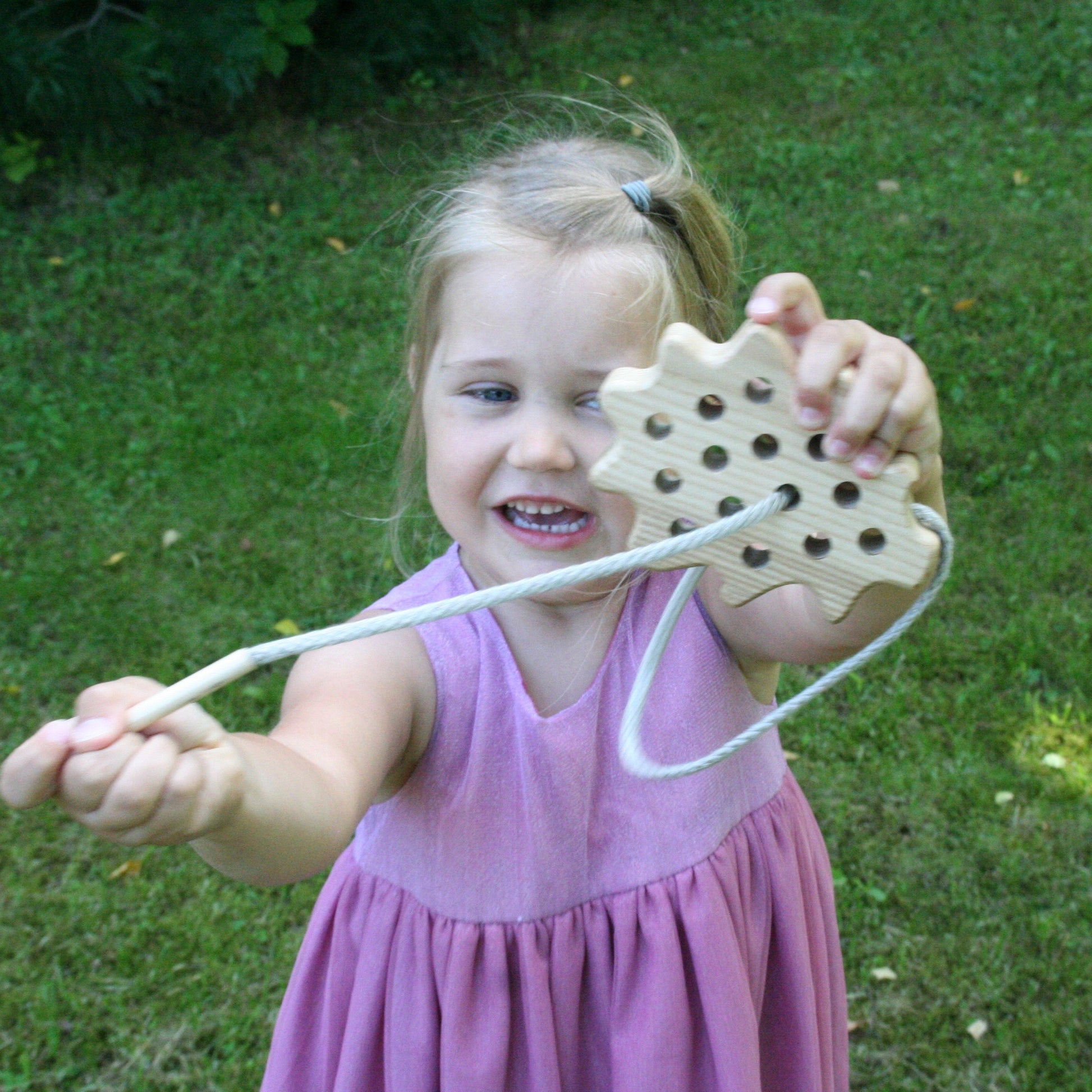 Engage your child's imagination as they explore the world of threading and lacing with this charming and sustainable toy. The carefully carved details and smooth, natural wood provide a tactile experience that stimulates sensory development.