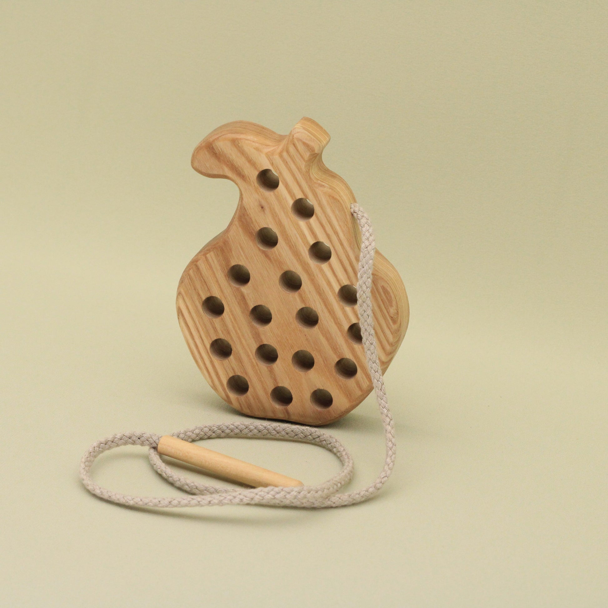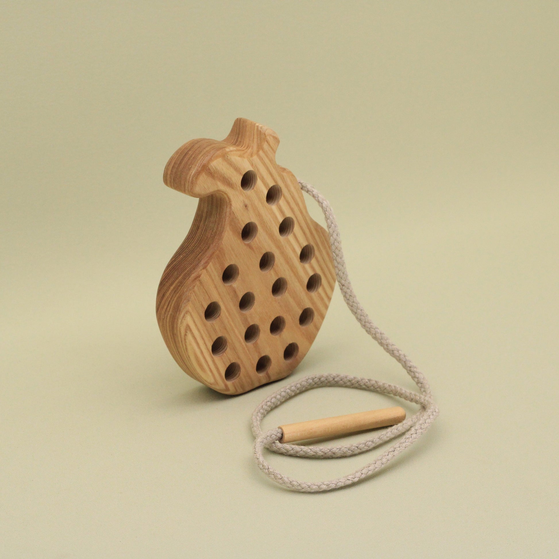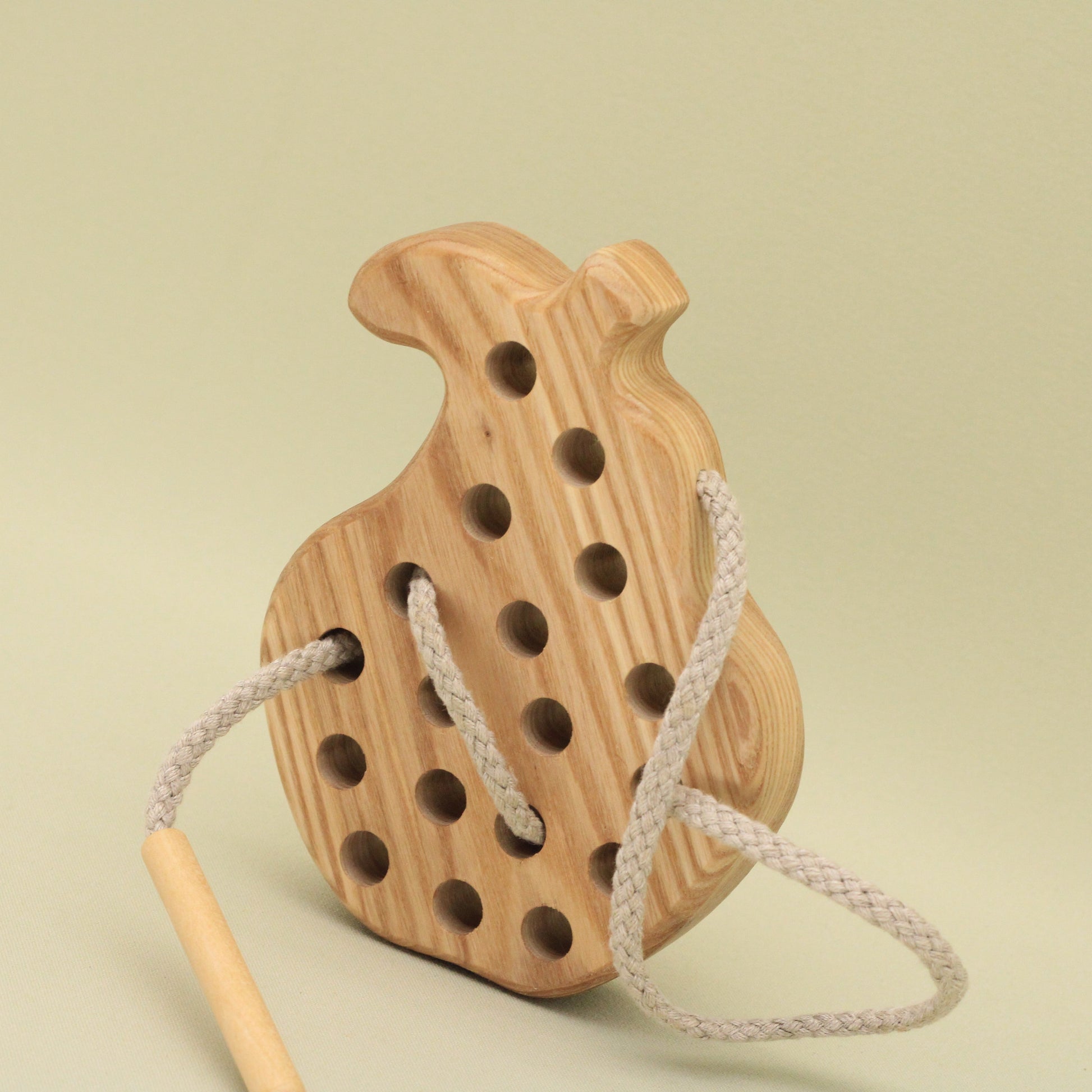 Engage your child's imagination as they explore the world of threading and lacing with this charming and natural toy. The carefully carved details and smooth, natural wood provide a tactile experience that stimulates sensory development.