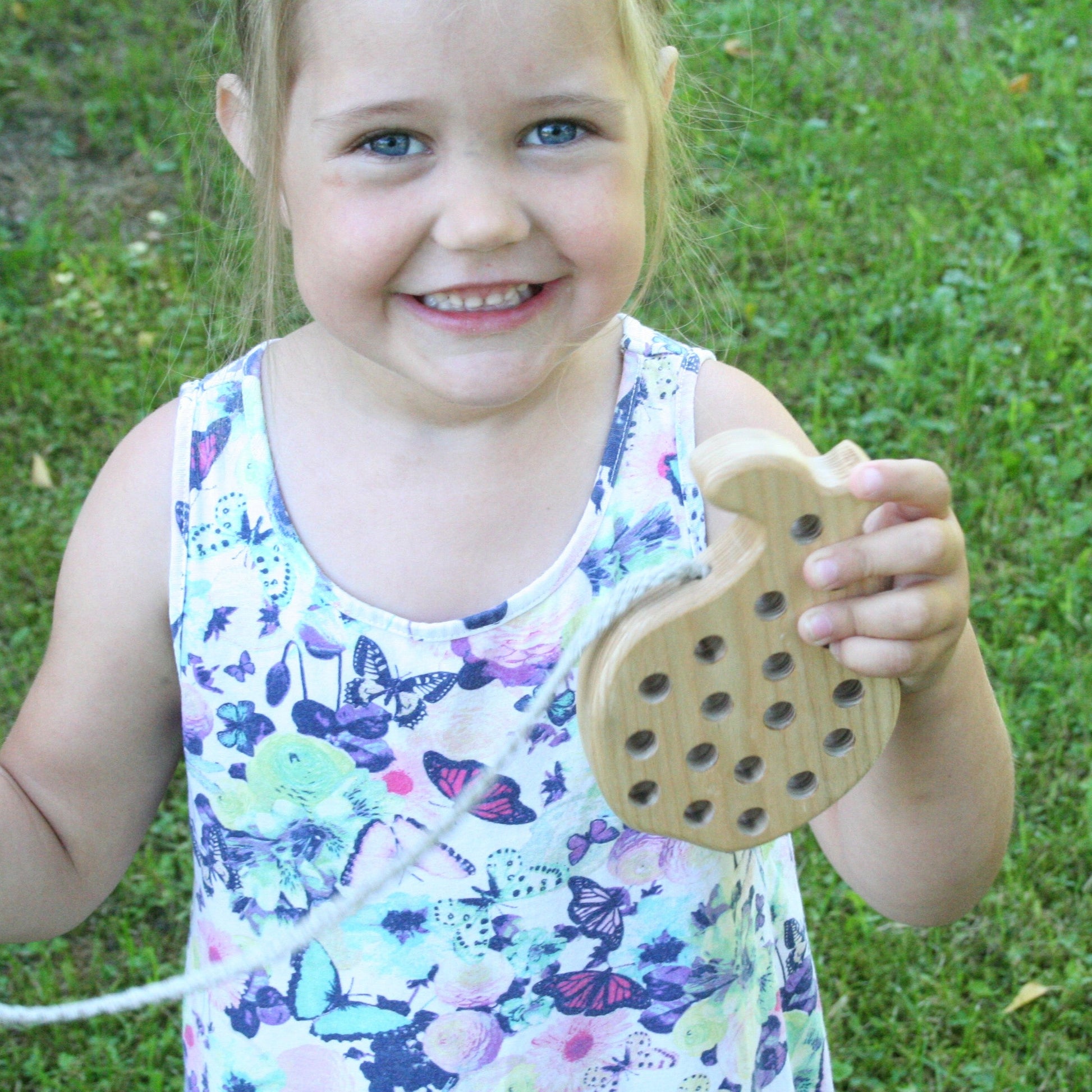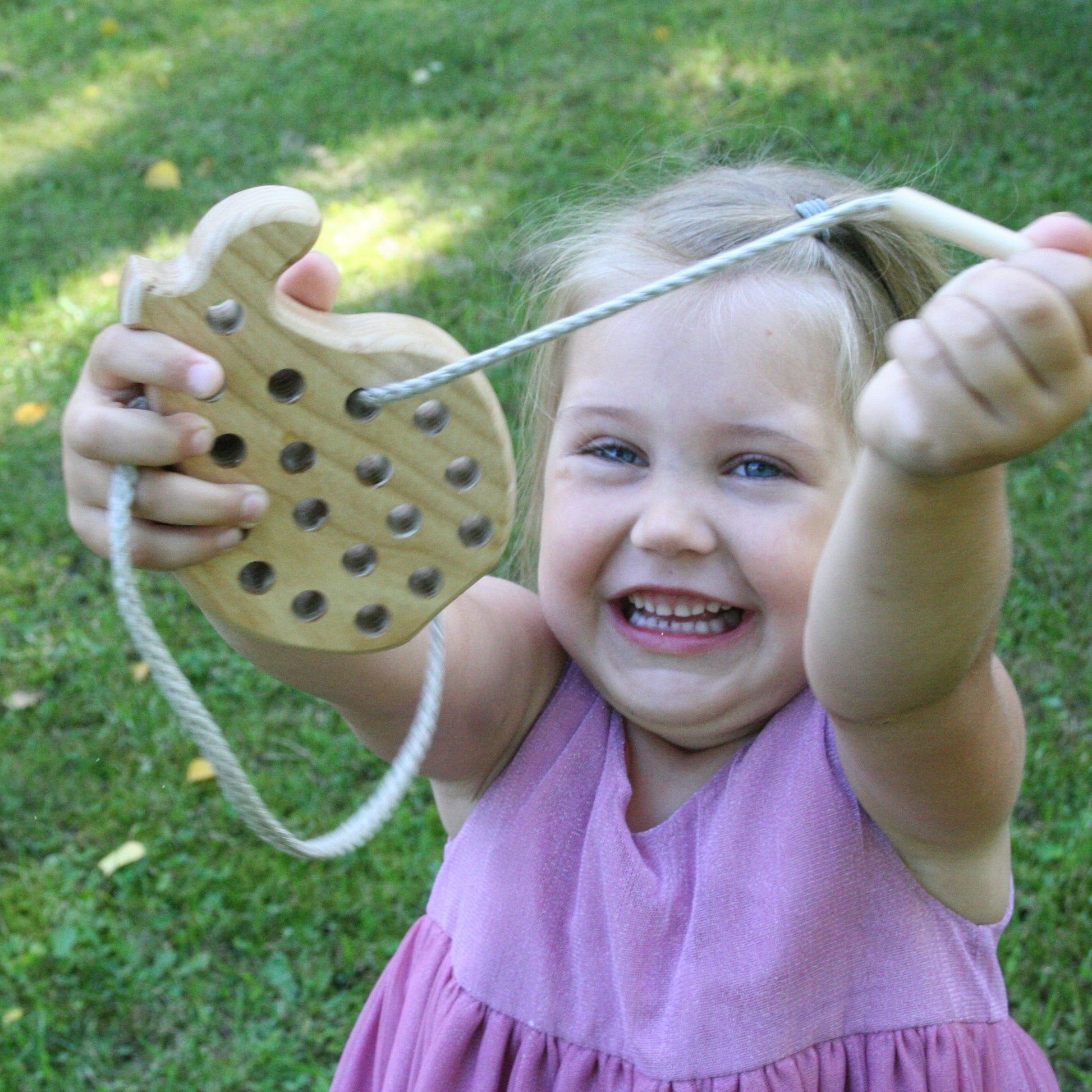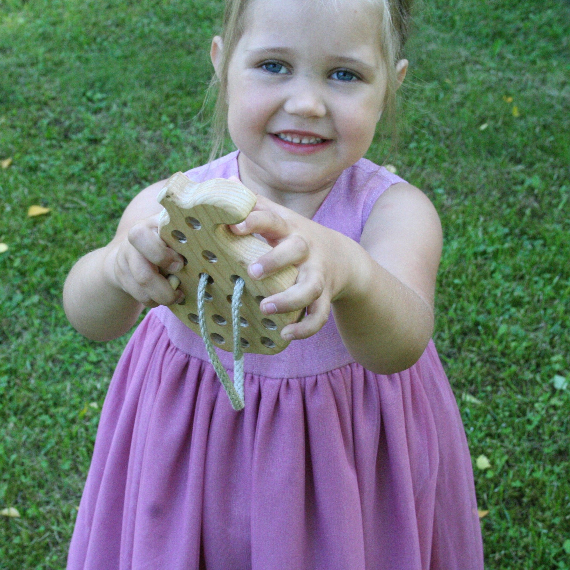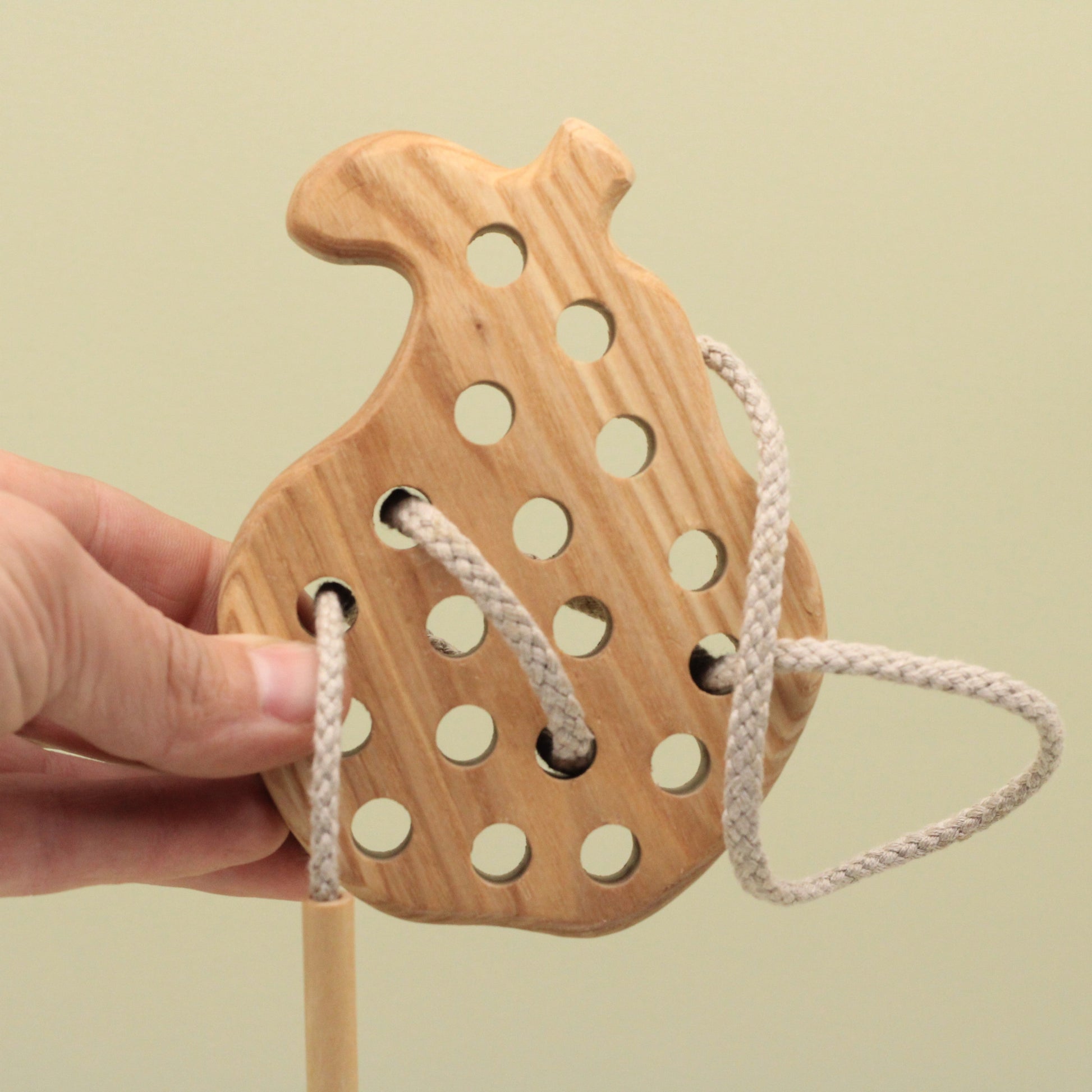 Engage your child's imagination as they explore the world of threading and lacing with this charming and natural toy. The carefully carved details and smooth, natural wood provide a tactile experience that stimulates sensory development.