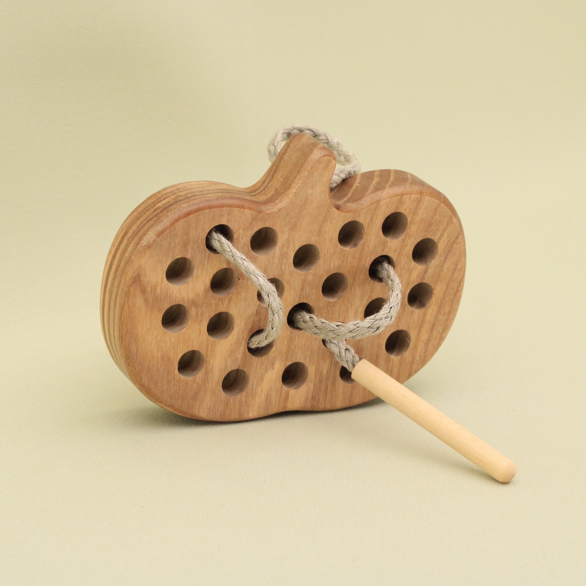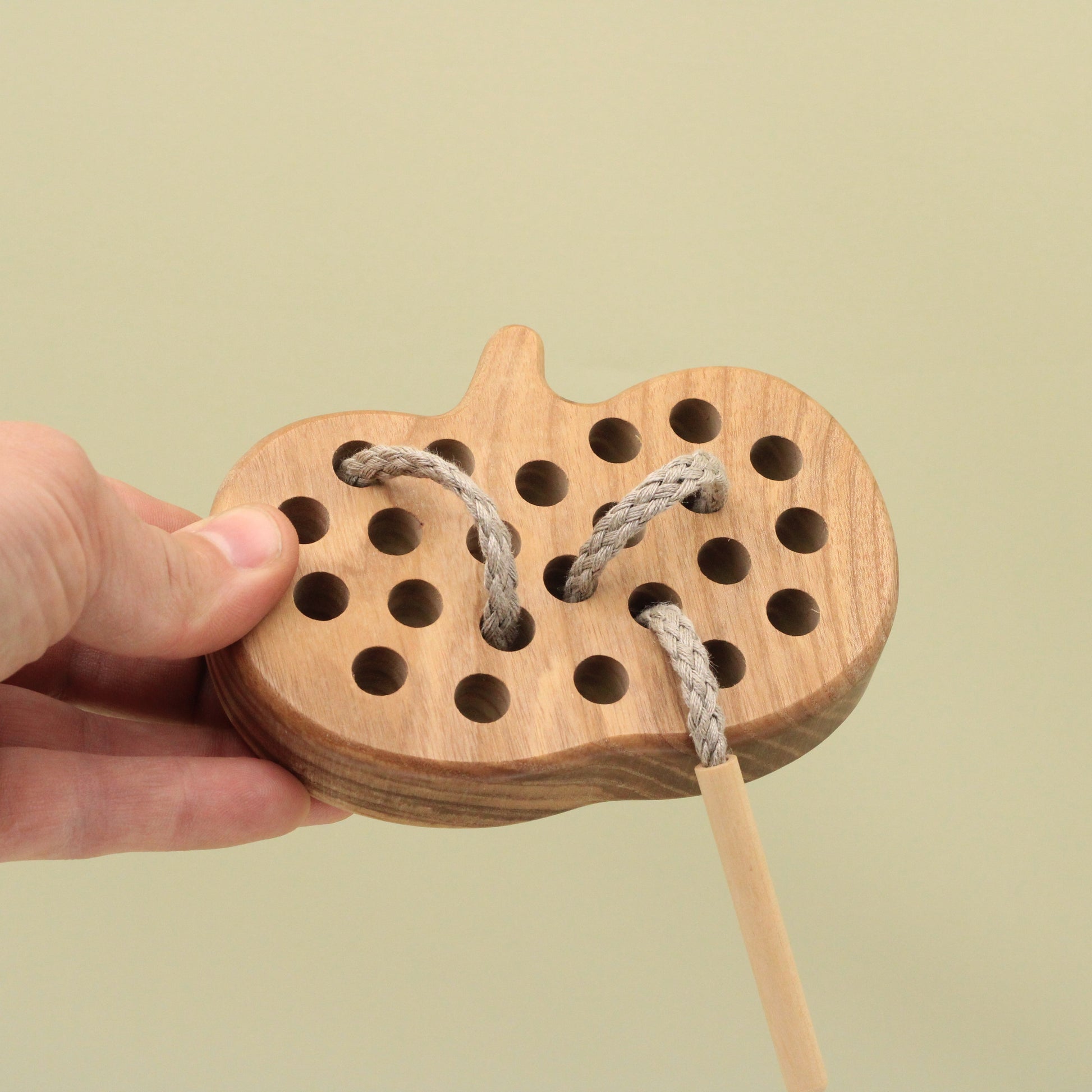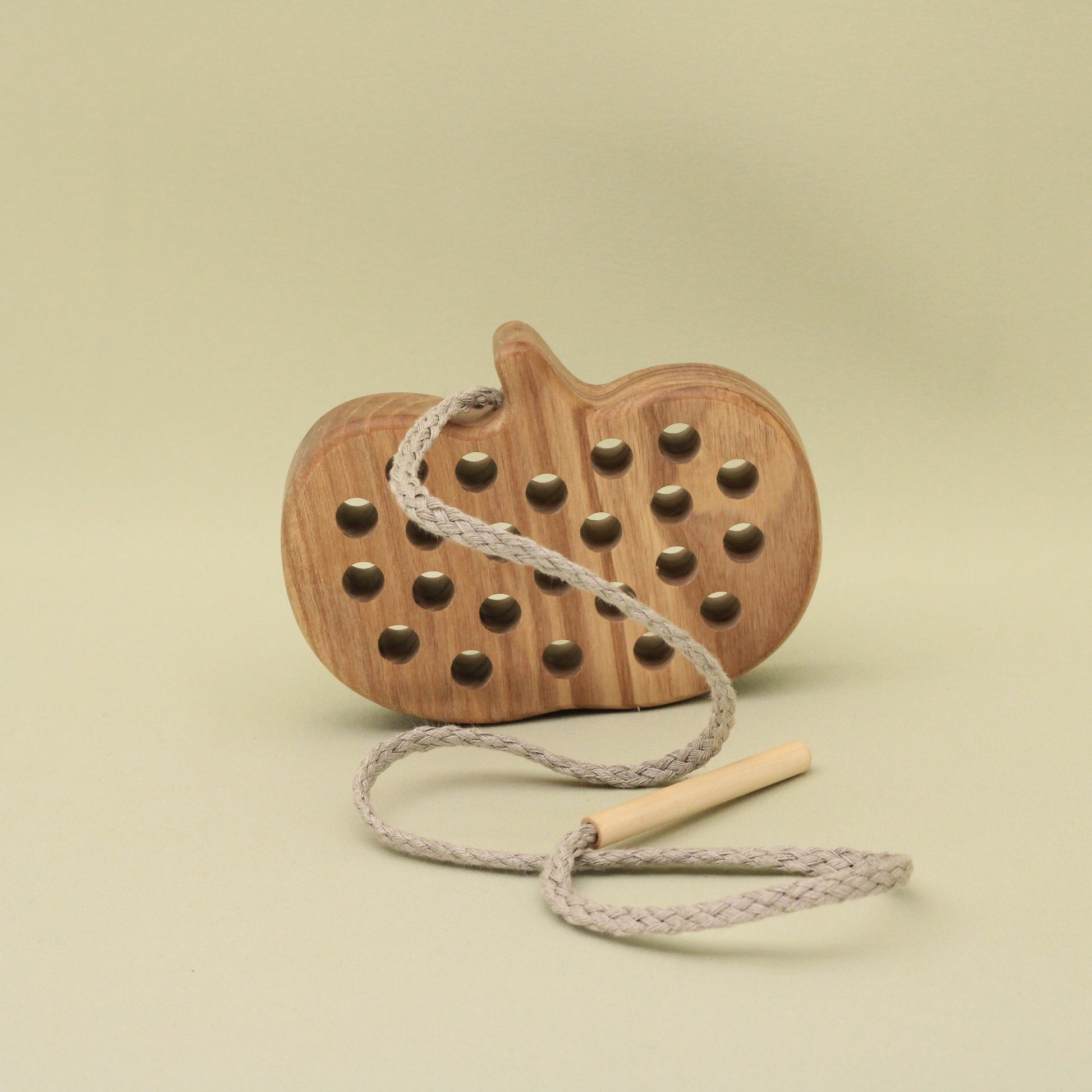 Engage your child's imagination as they explore the world of threading and lacing with this charming natural toy. The carefully carved details and smooth, natural wood provide a tactile experience that stimulates sensory development.