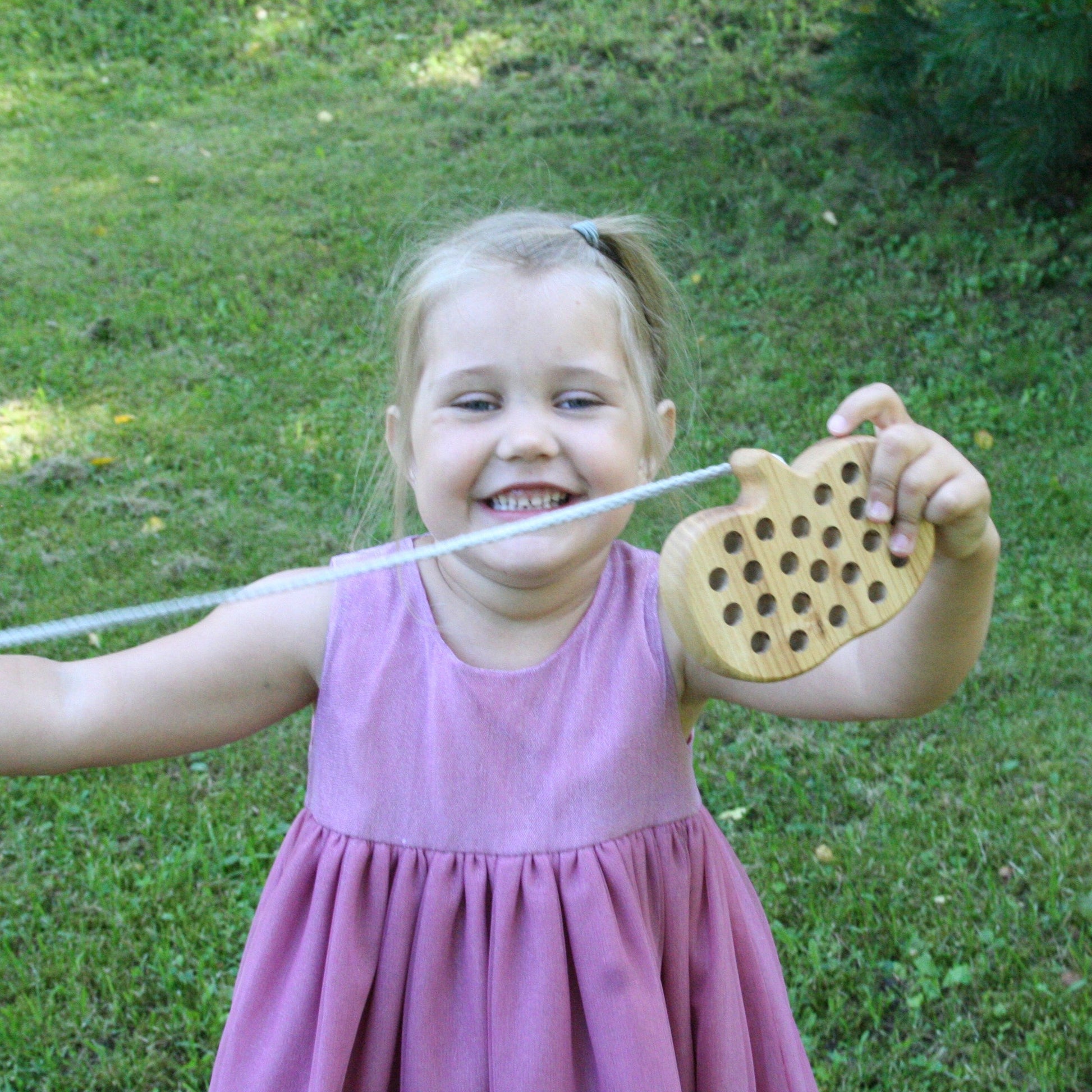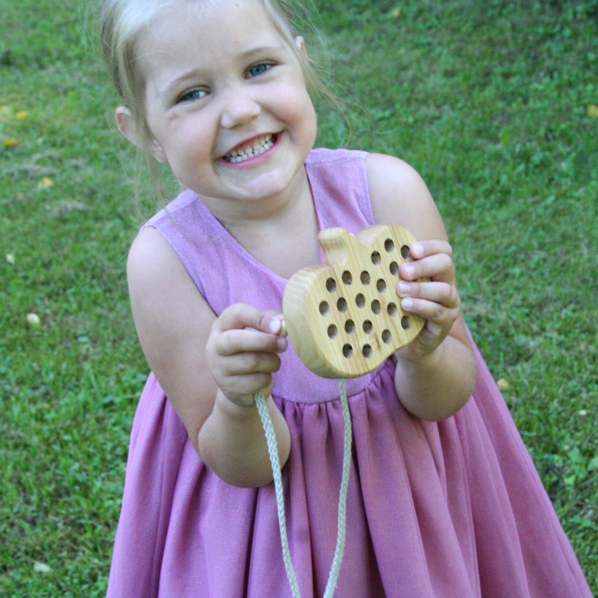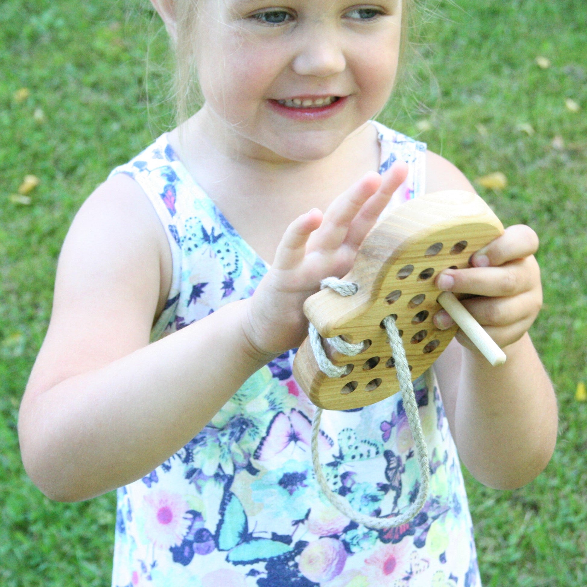Engage your child's imagination as they explore the world of threading and lacing with this charming natural toy. The carefully carved details and smooth, natural wood provide a tactile experience that stimulates sensory development.