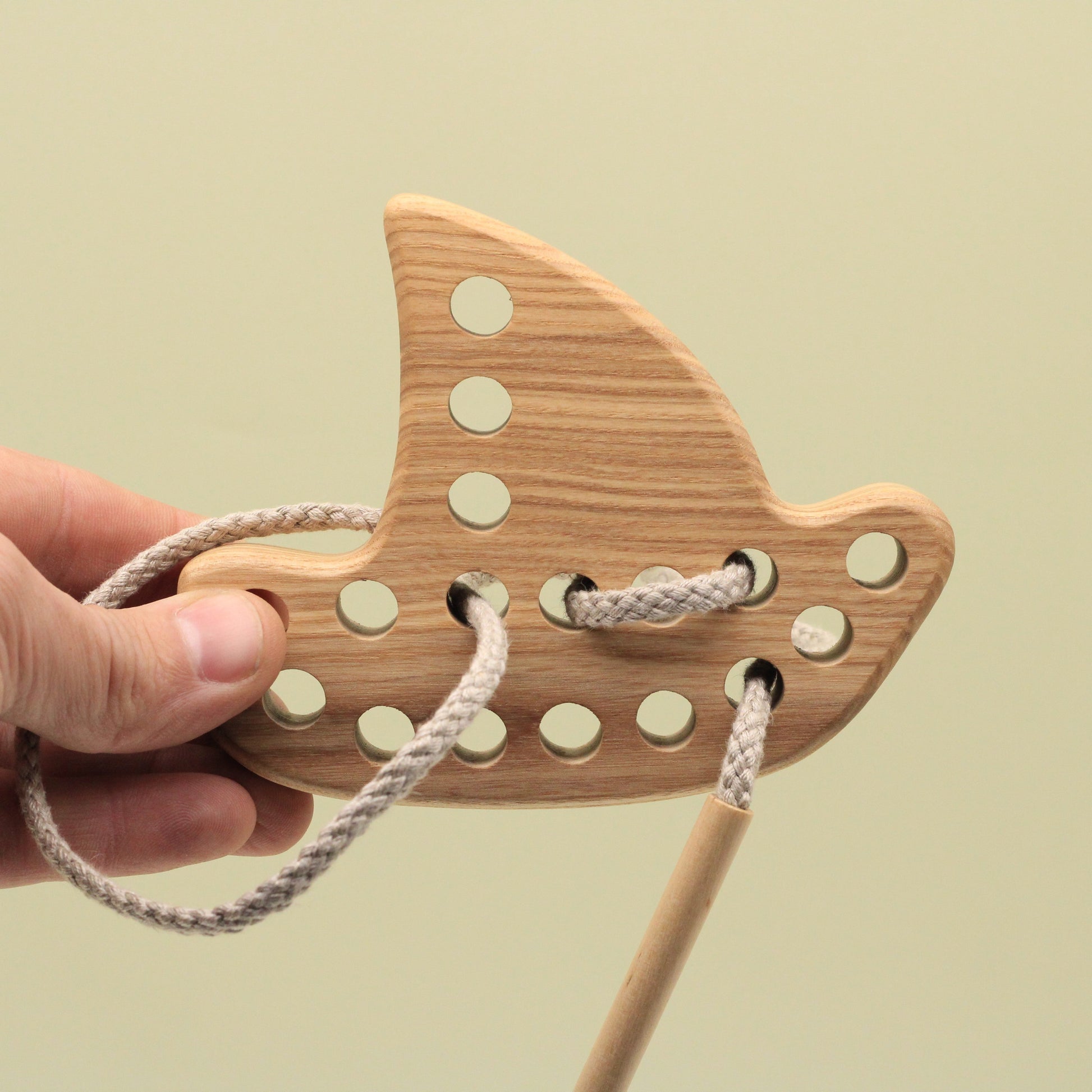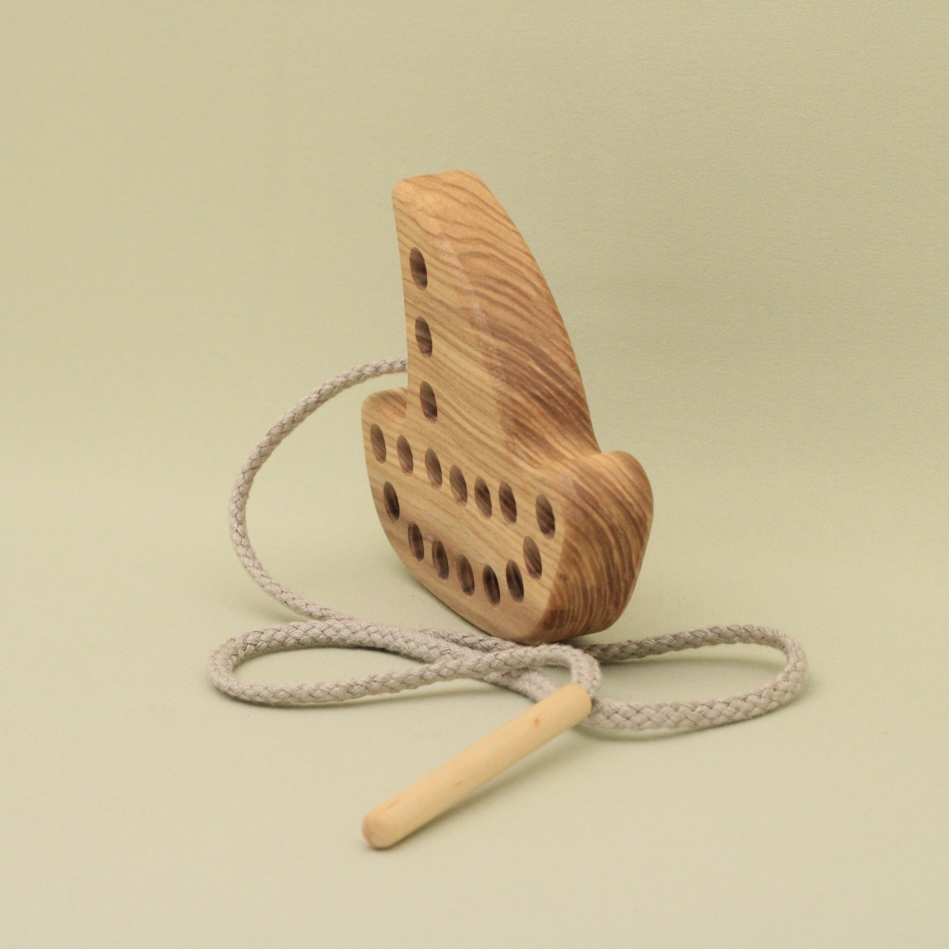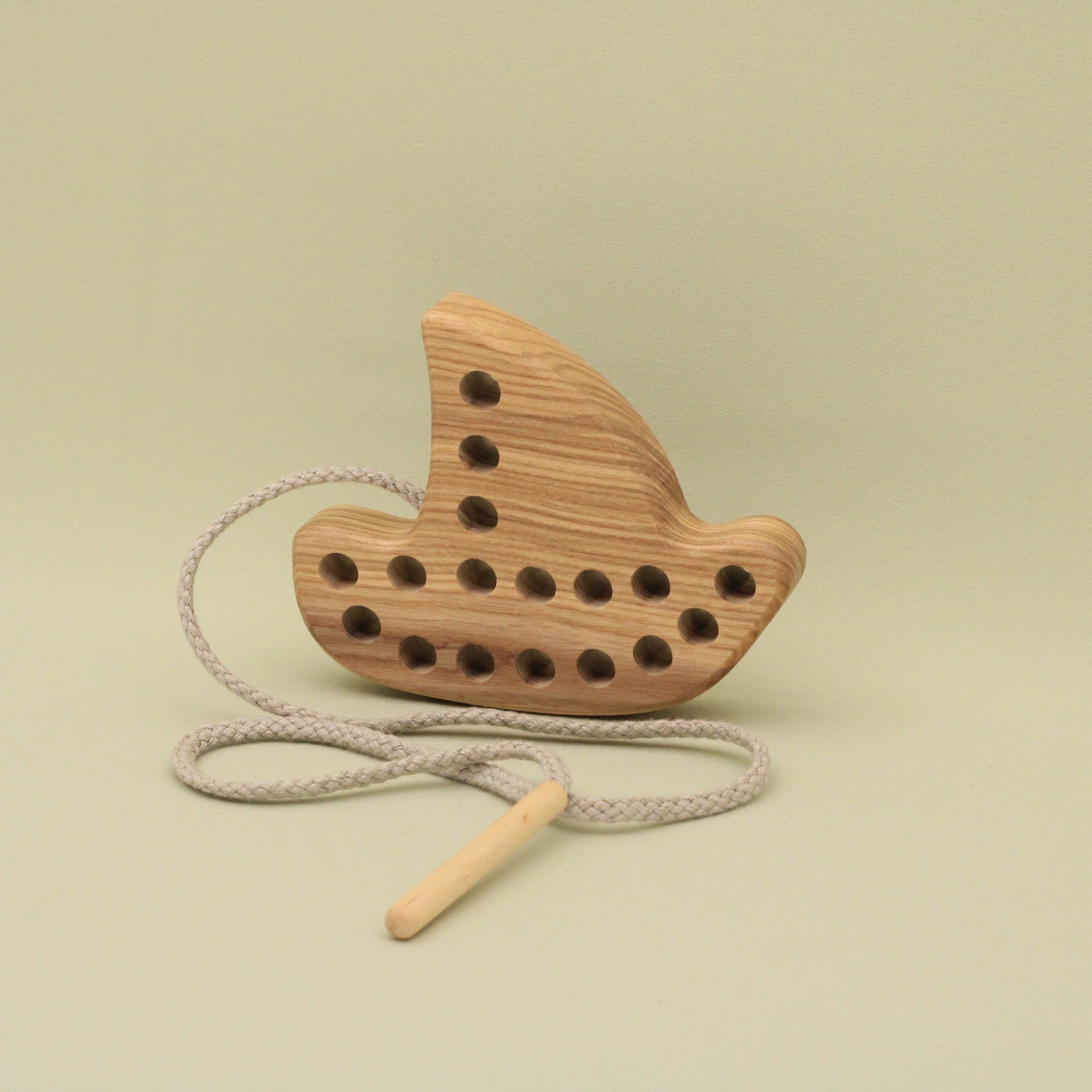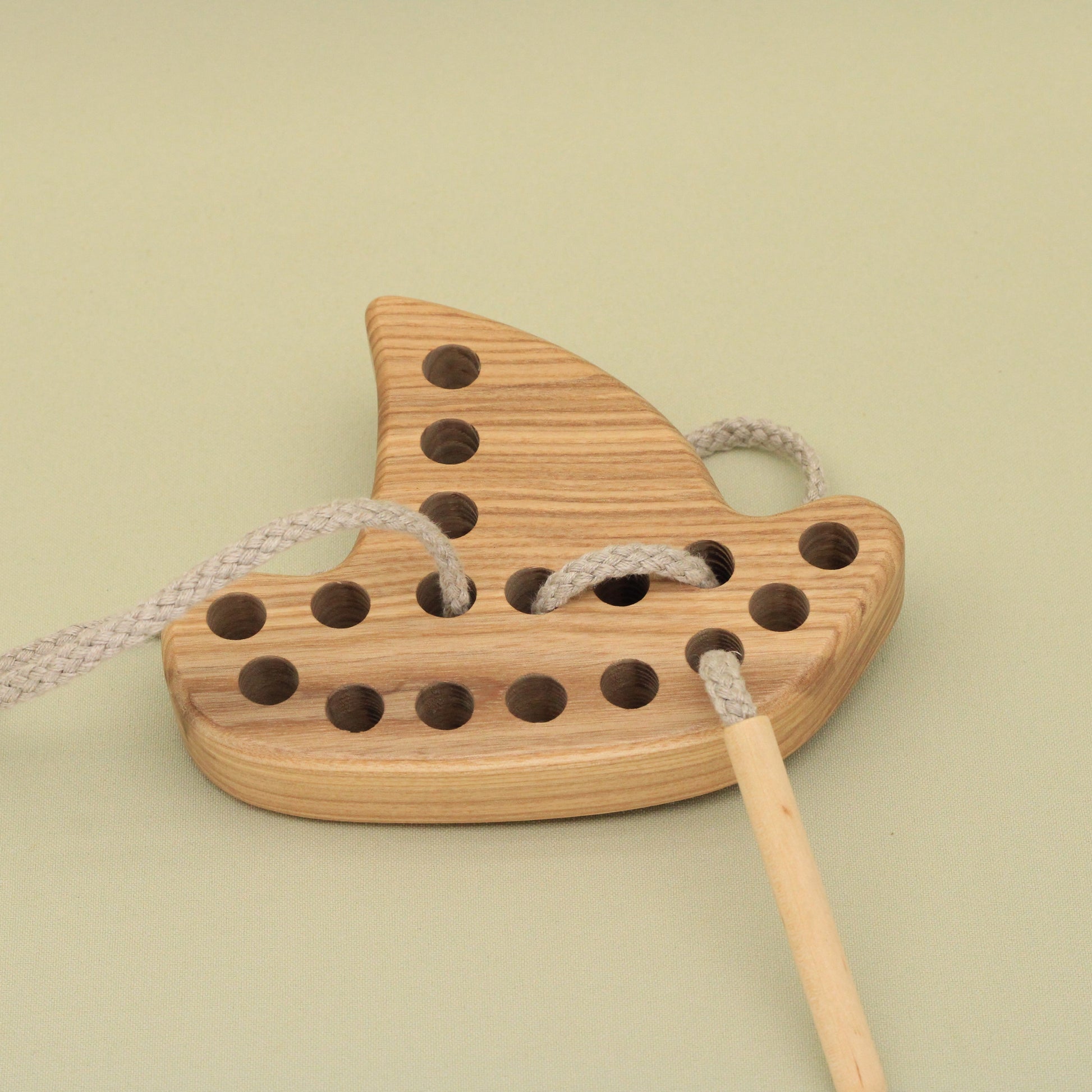 Engage your child's imagination as they explore the world of threading and lacing with this charming natural toy. The carefully carved details and smooth, natural wood provide a tactile experience that stimulates sensory development.