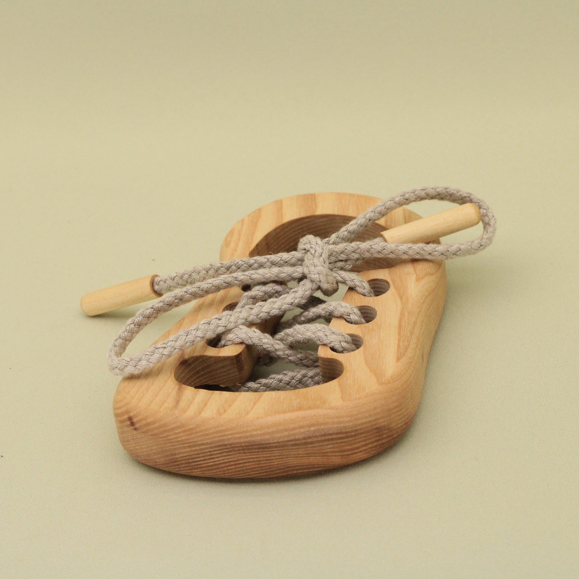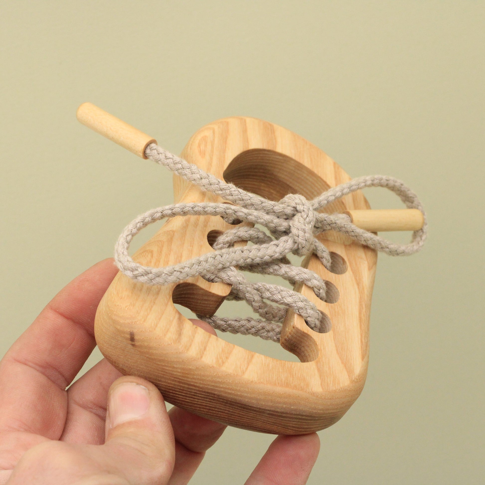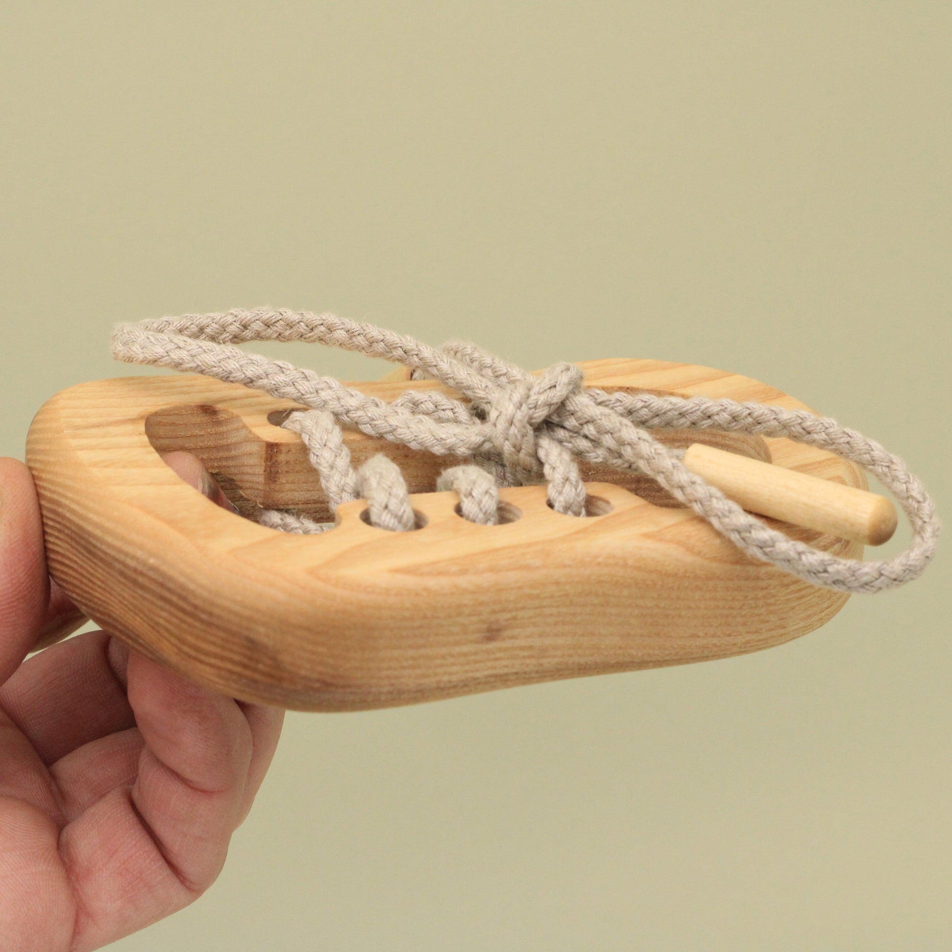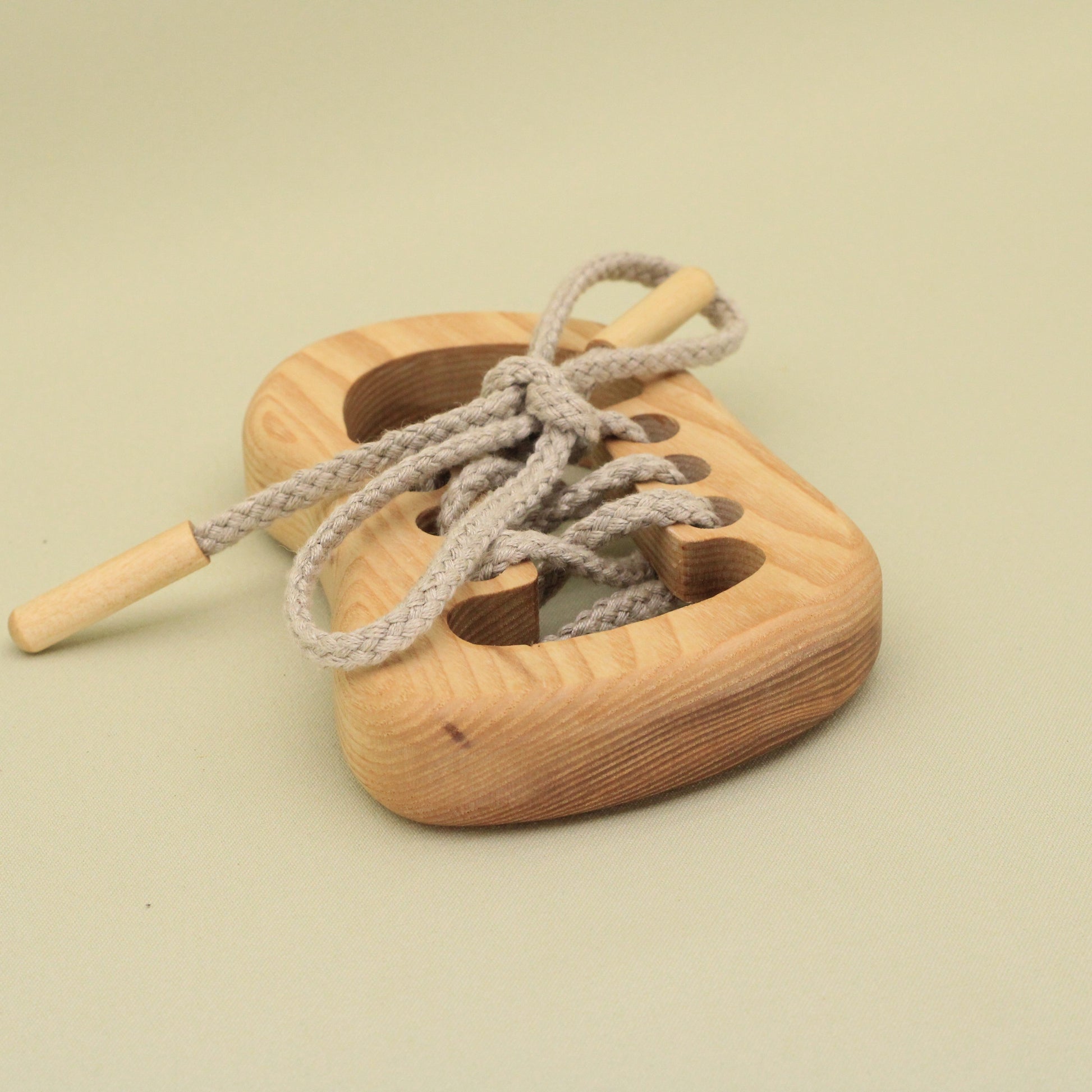 Engage your child's imagination as they explore the world of threading and lacing with this charming wooden toy. The carefully carved details and smooth, natural wood provide a tactile experience that stimulates sensory development.