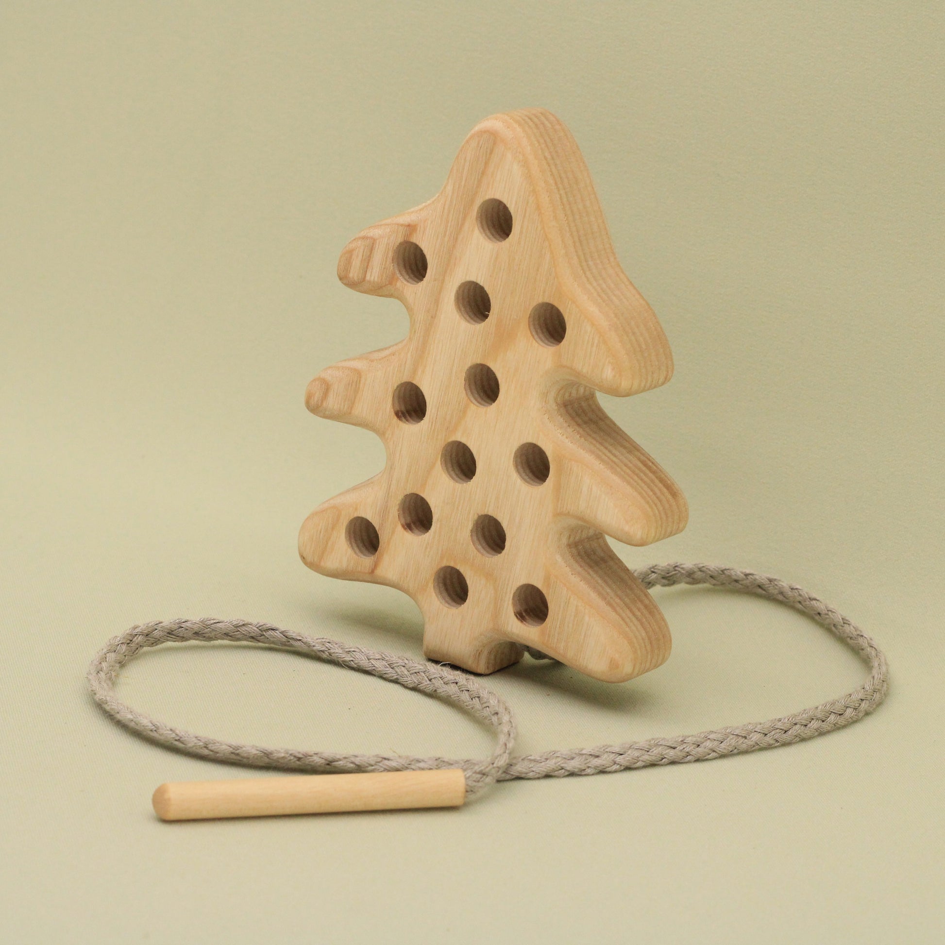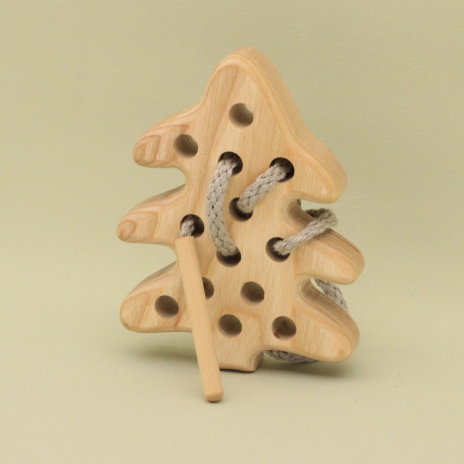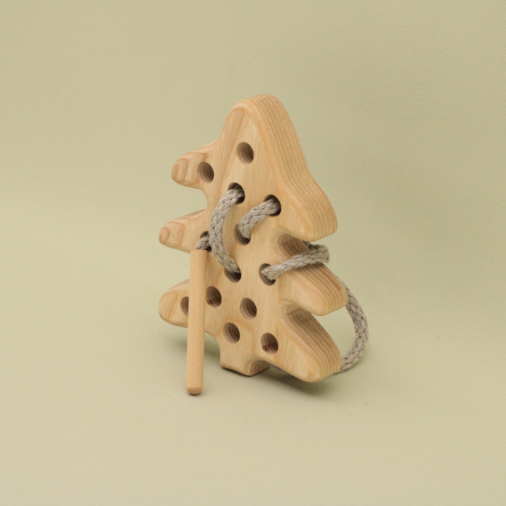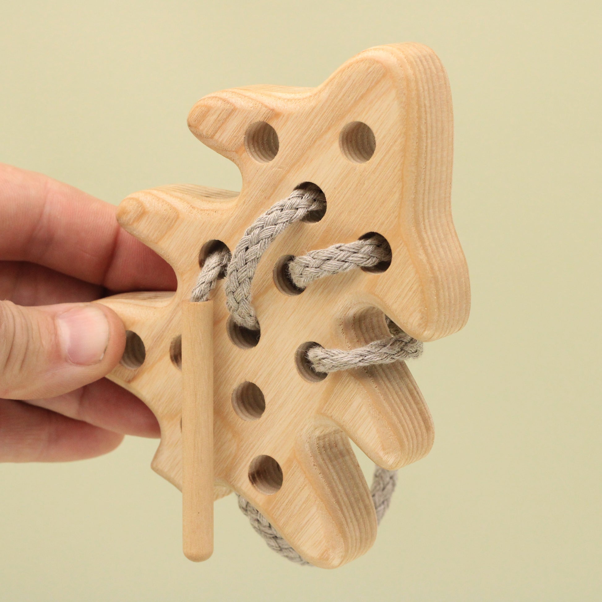 Engage your child's imagination as they explore the world of threading and lacing with this charming natural toy. The carefully carved details and smooth, natural wood provide a tactile experience that stimulates sensory development.