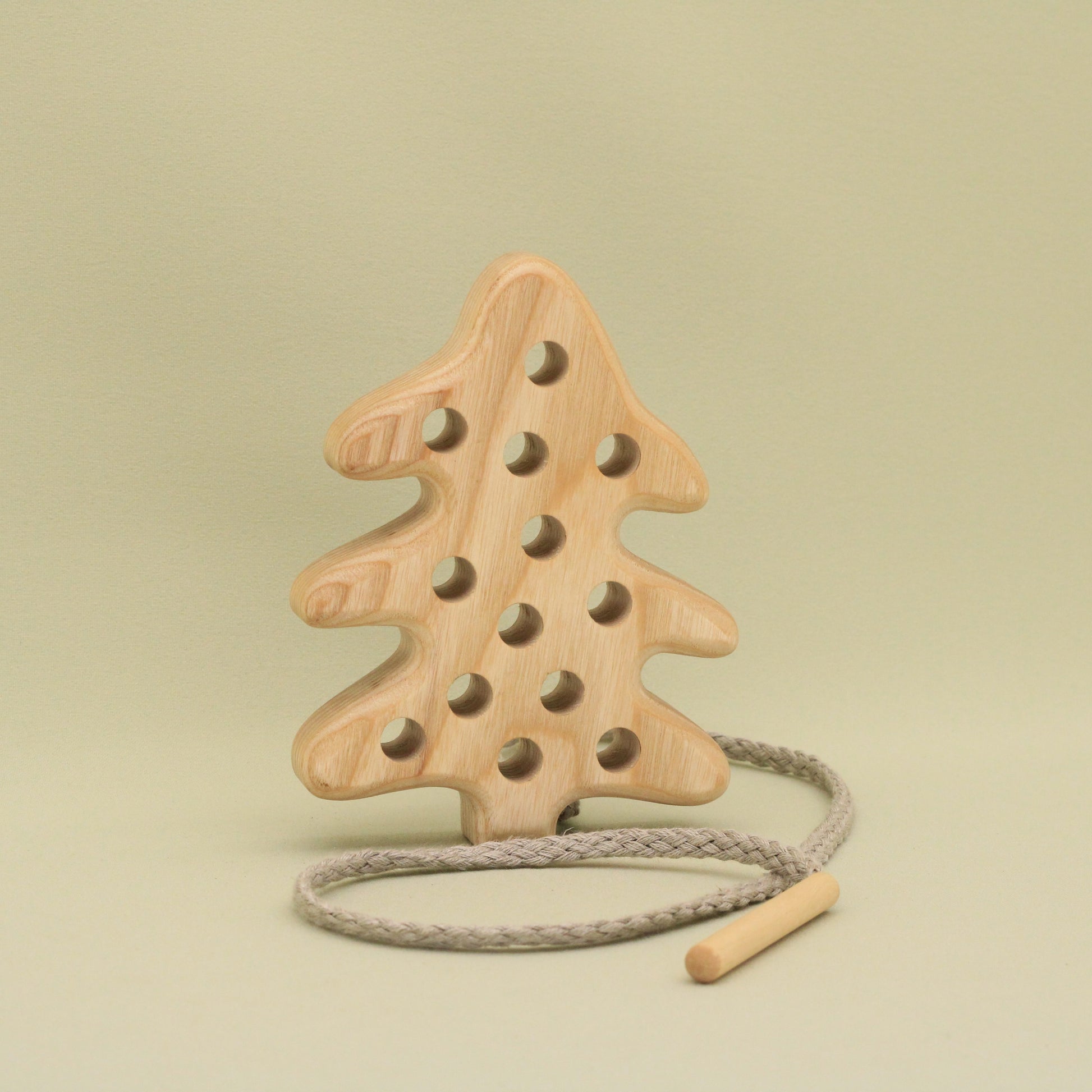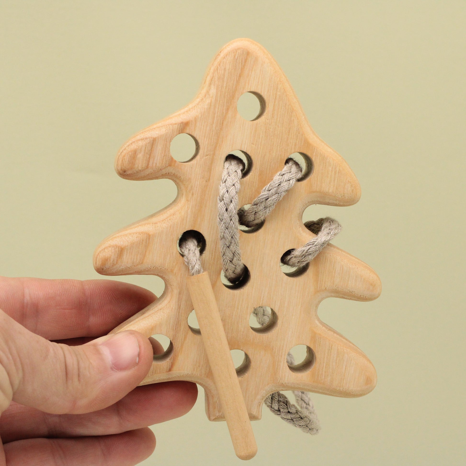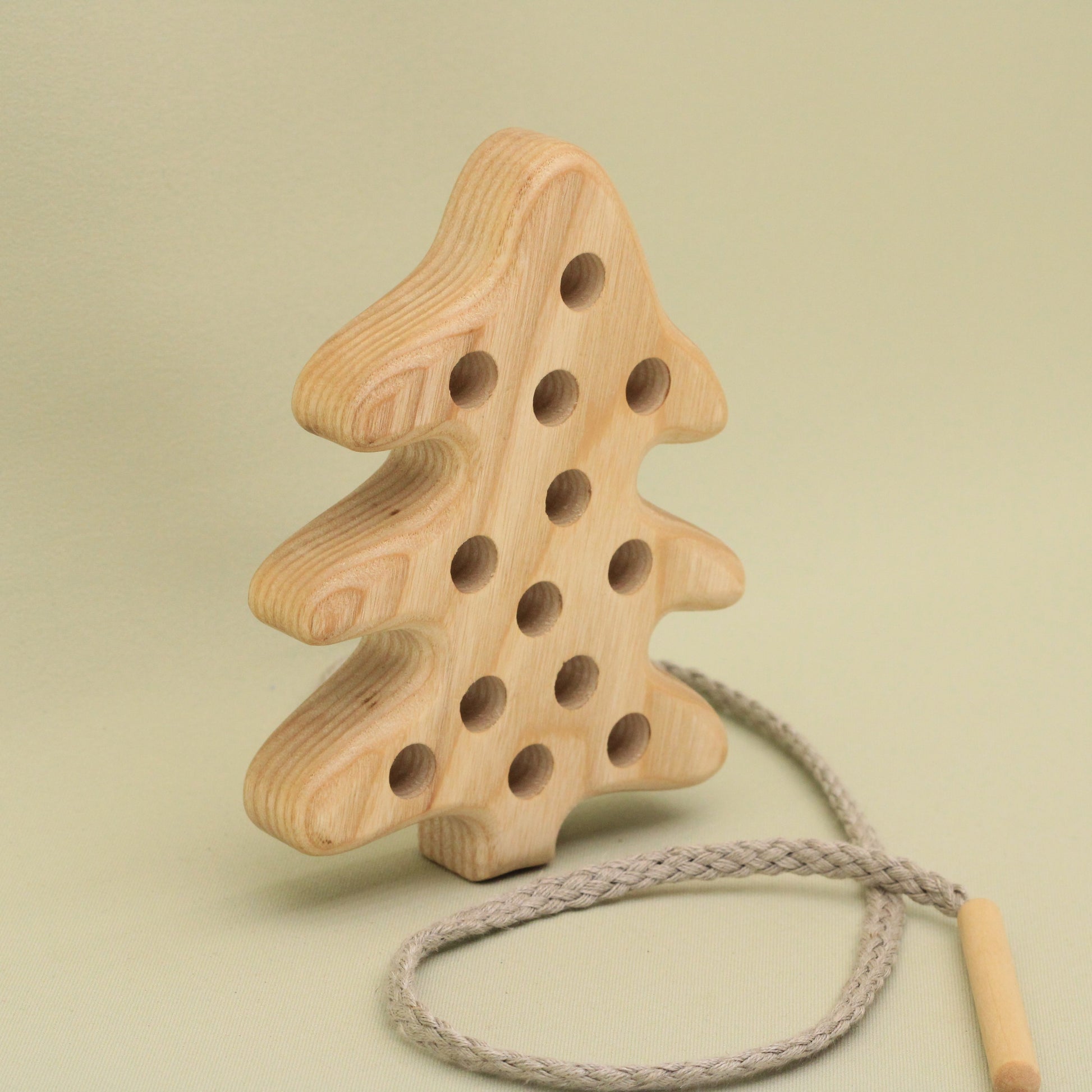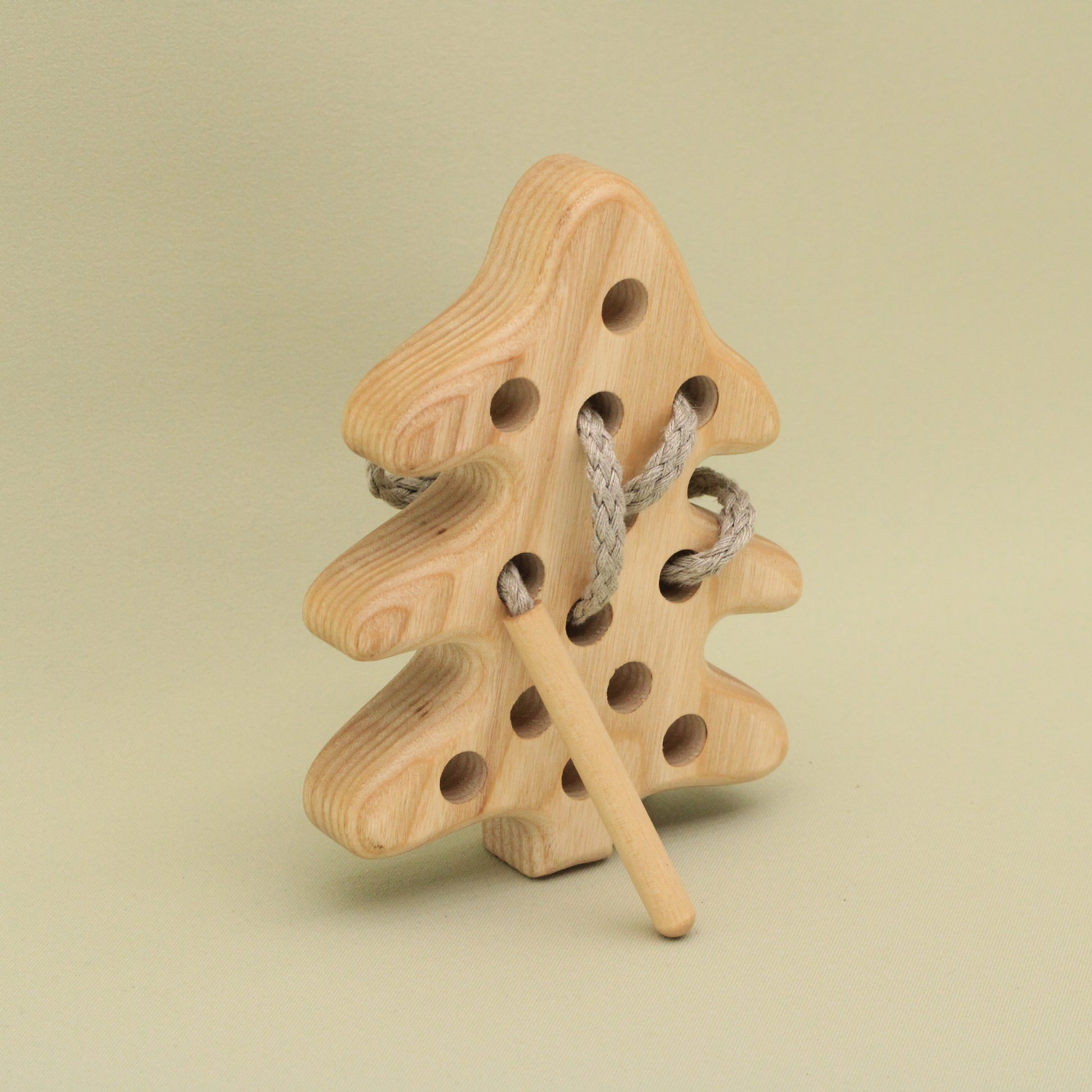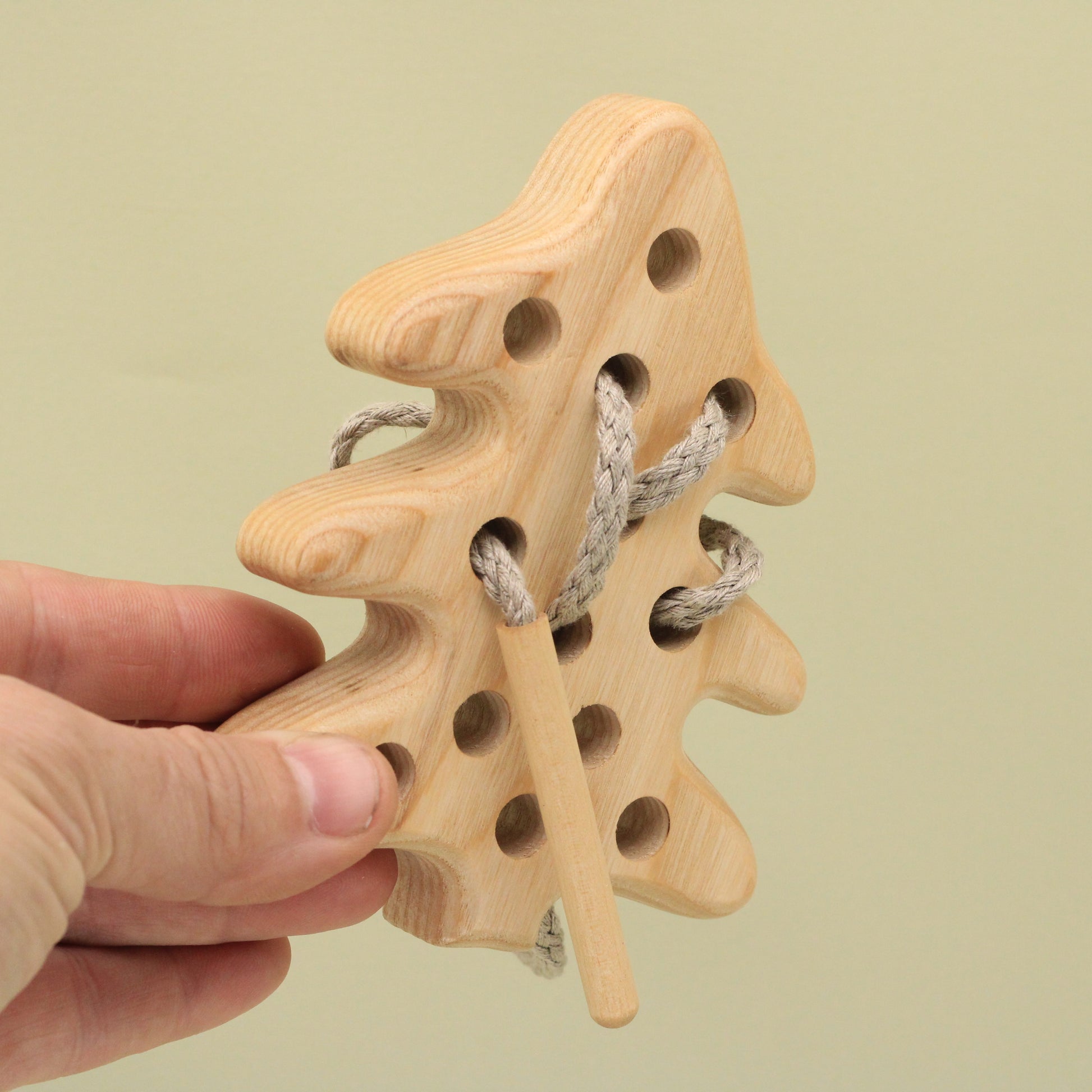 Engage your child's imagination as they explore the world of threading and lacing with this charming natural toy. The carefully carved details and smooth, natural wood provide a tactile experience that stimulates sensory development.
