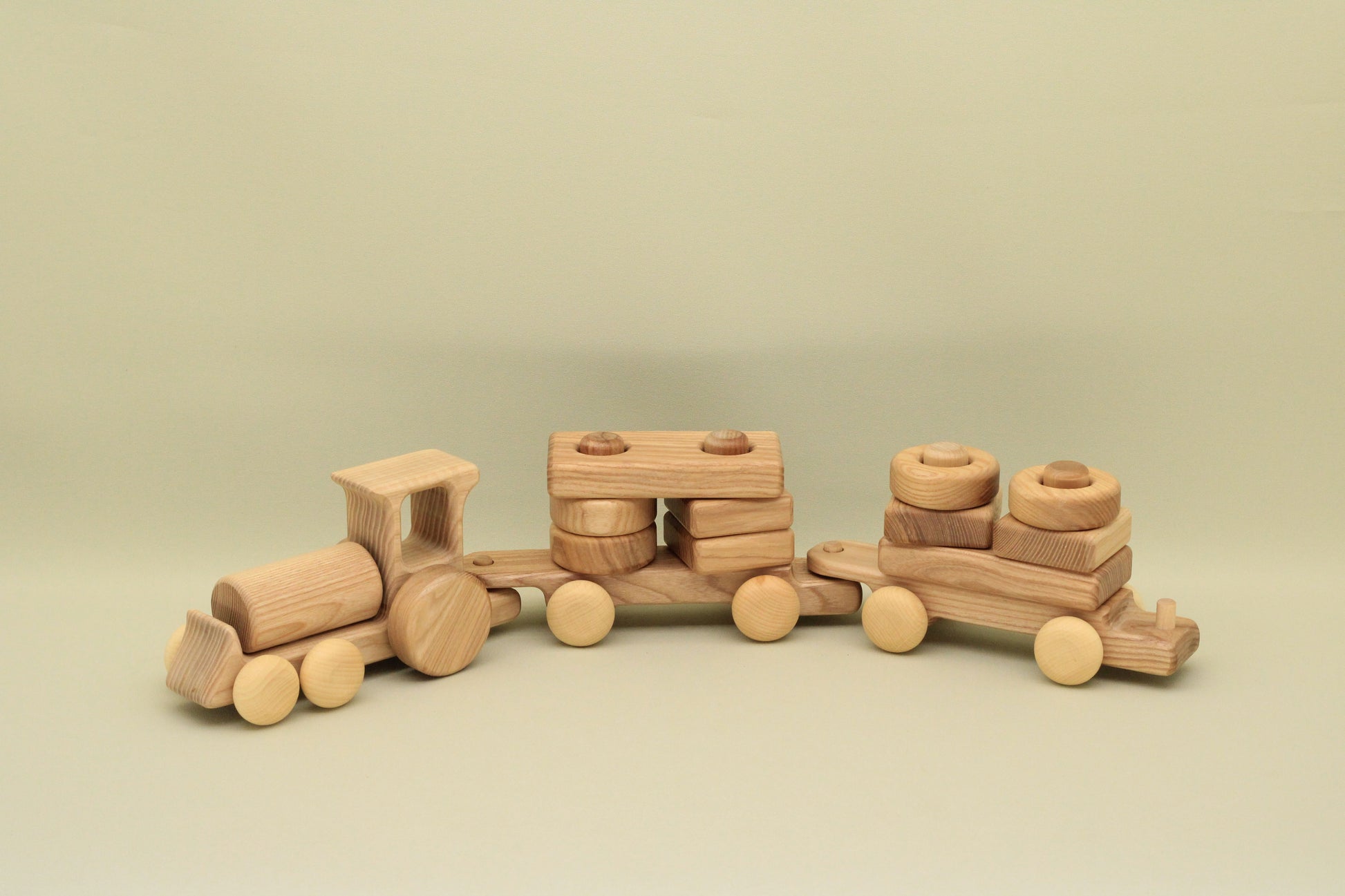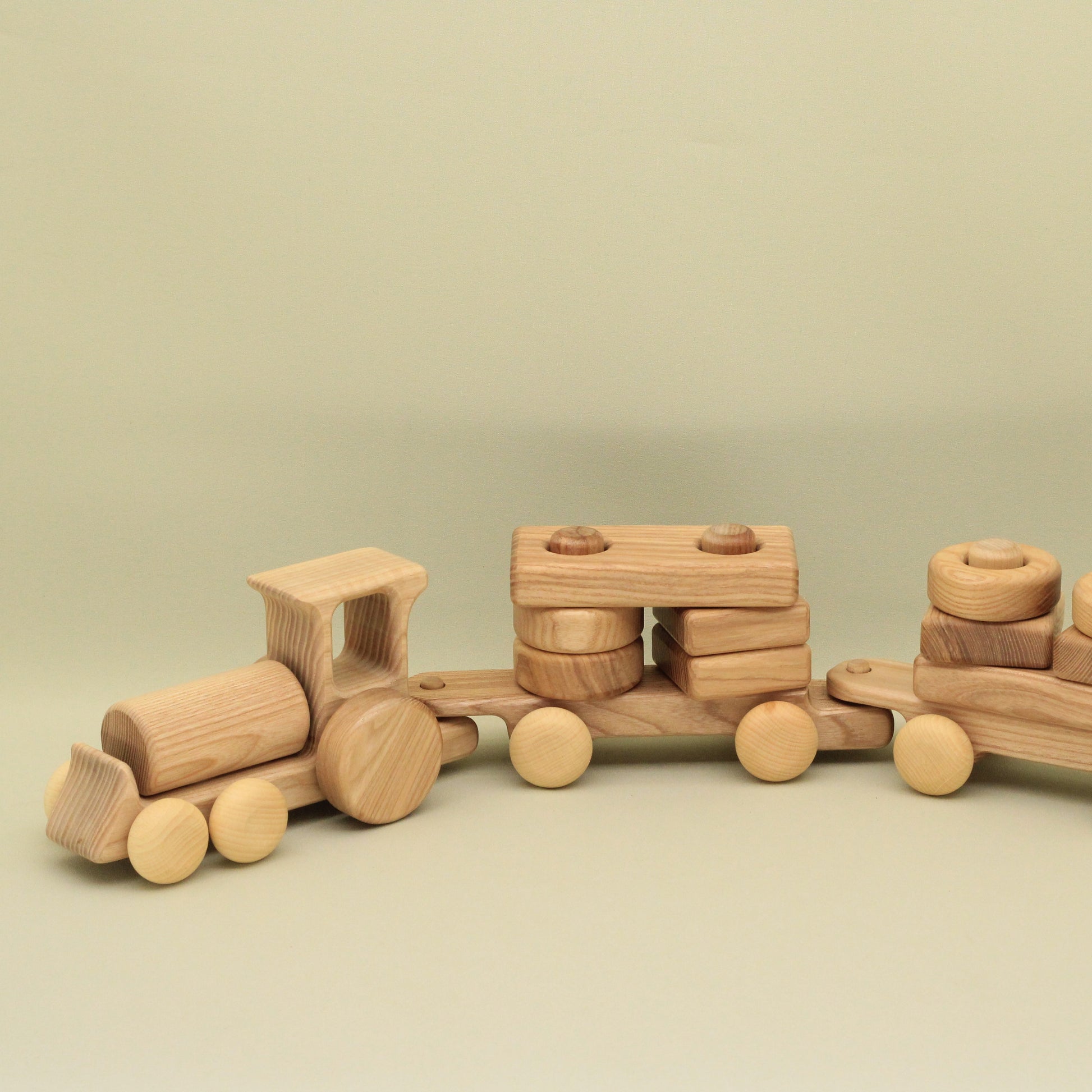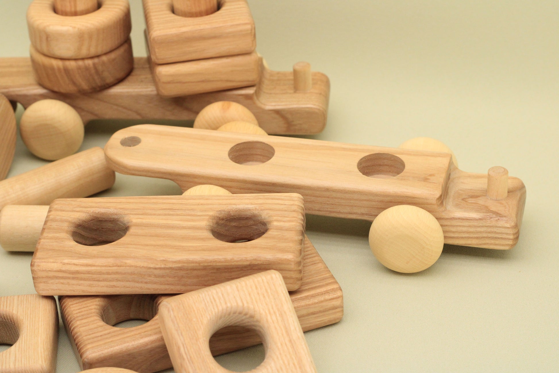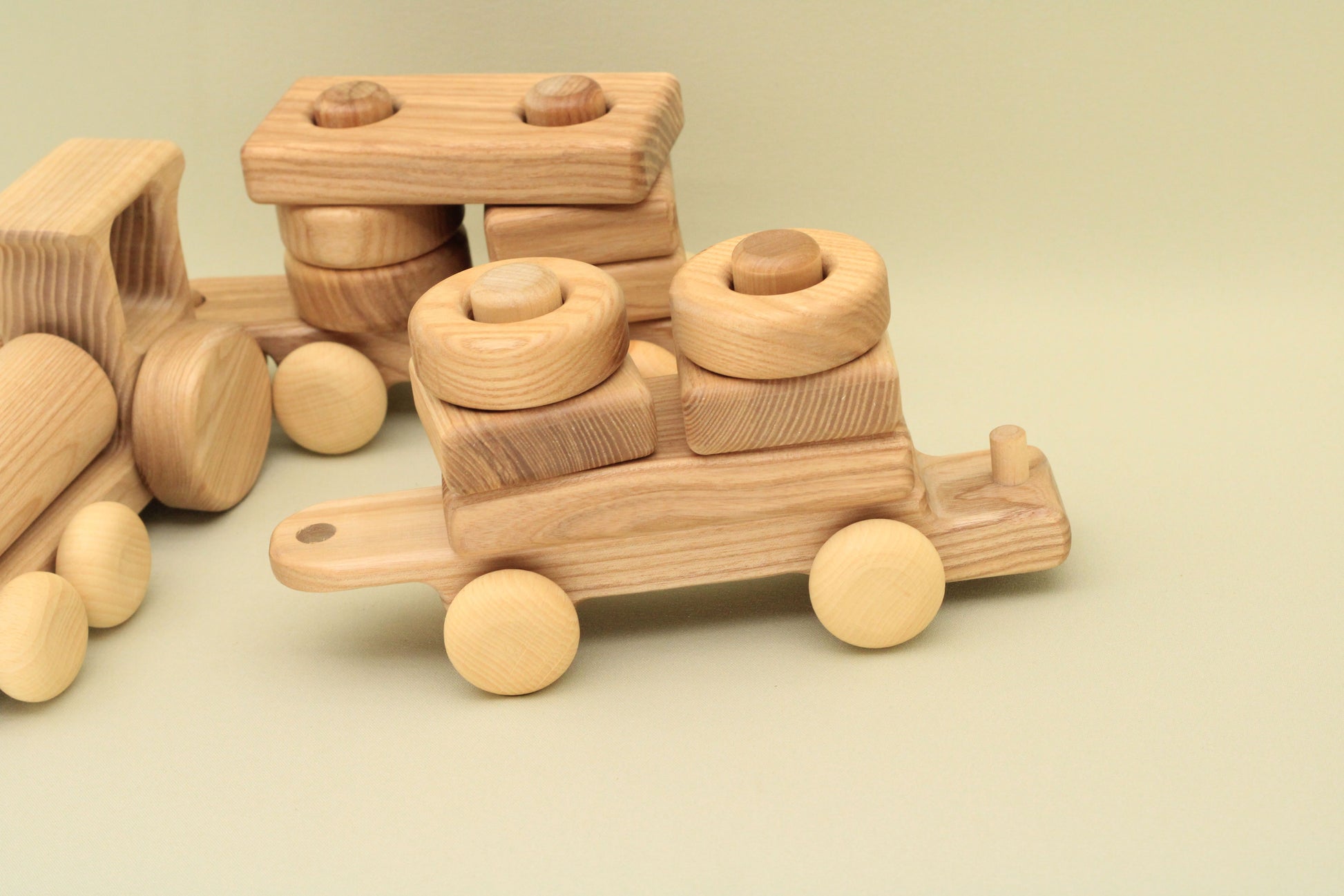 Wooden Stacking Train: Handmade, Educational, Montessori, Locomotive + 2 Wagons, 17 Building Blocks