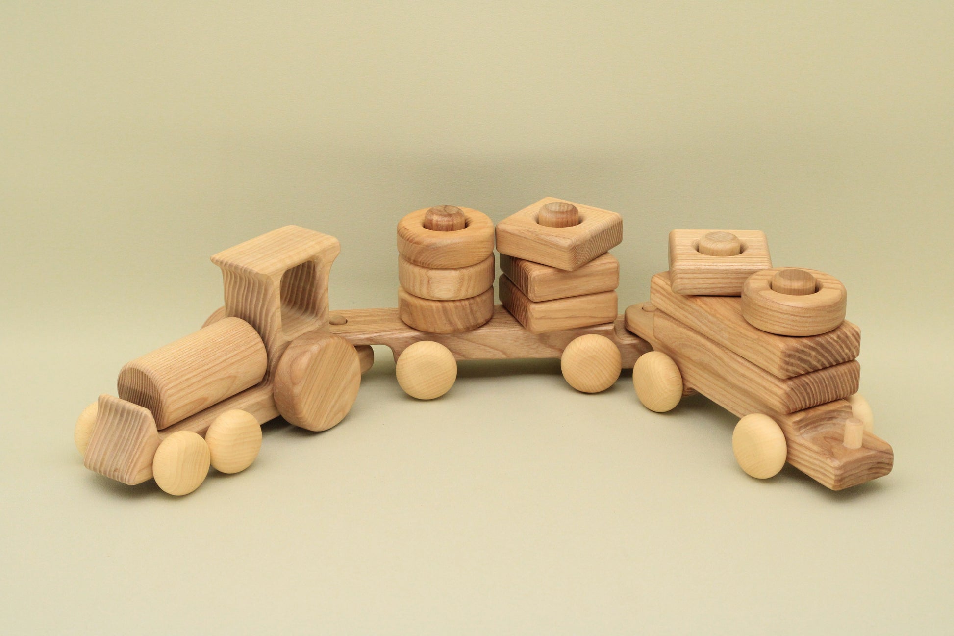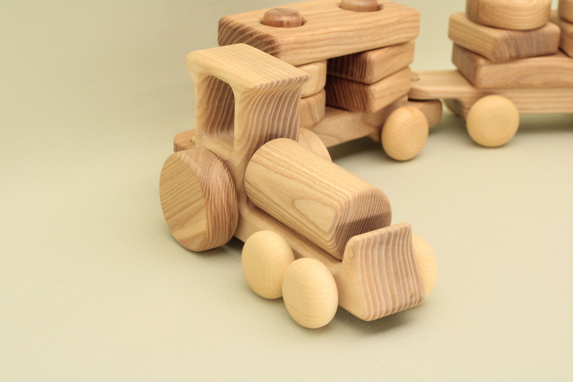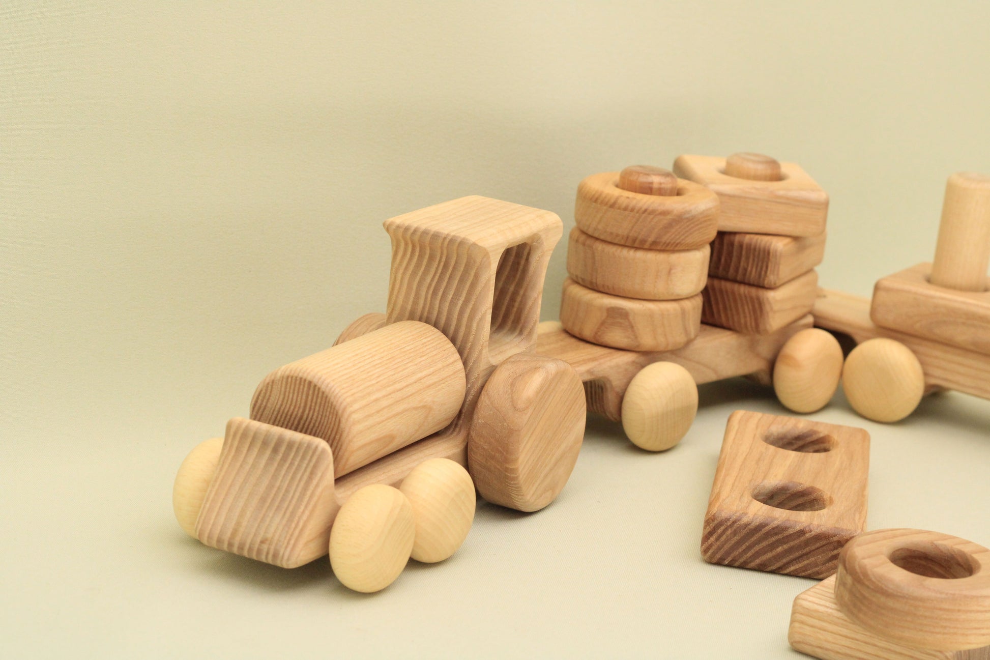 Wooden Stacking Train: Handmade, Educational, Montessori, Locomotive + 2 Wagons, 17 Building Blocks