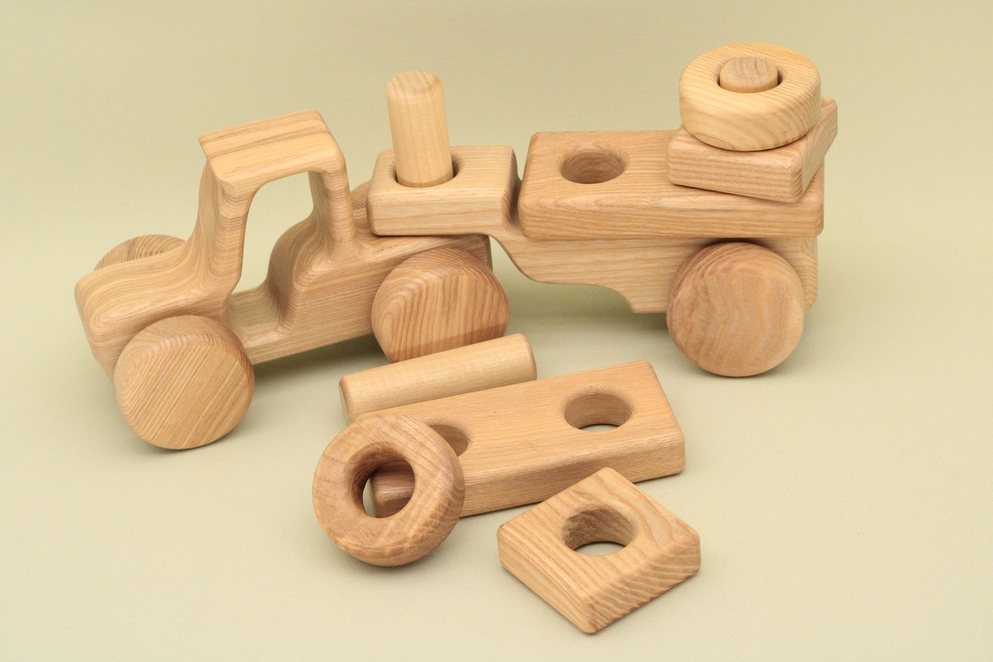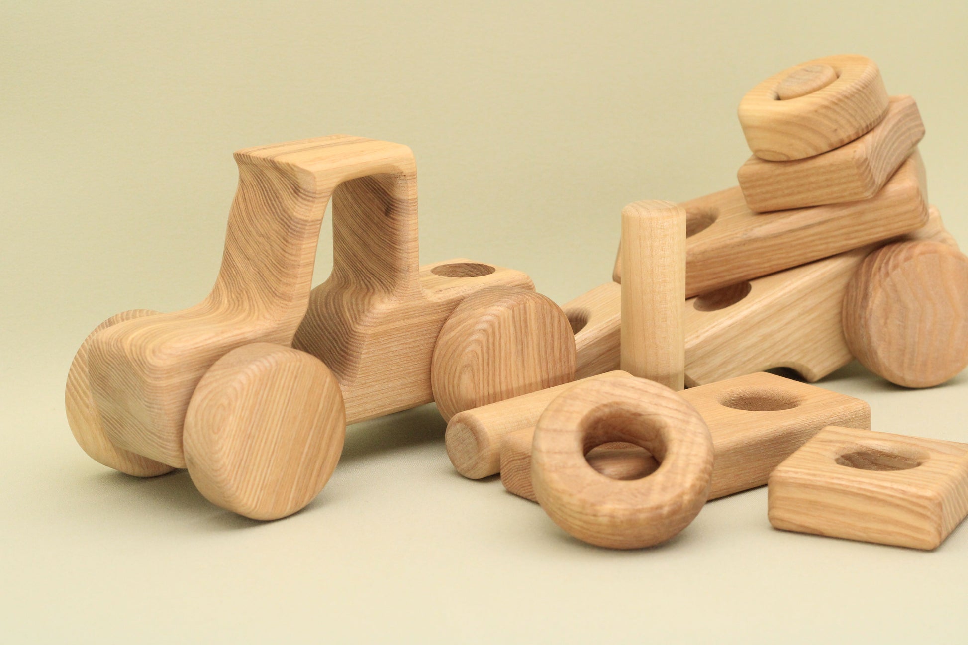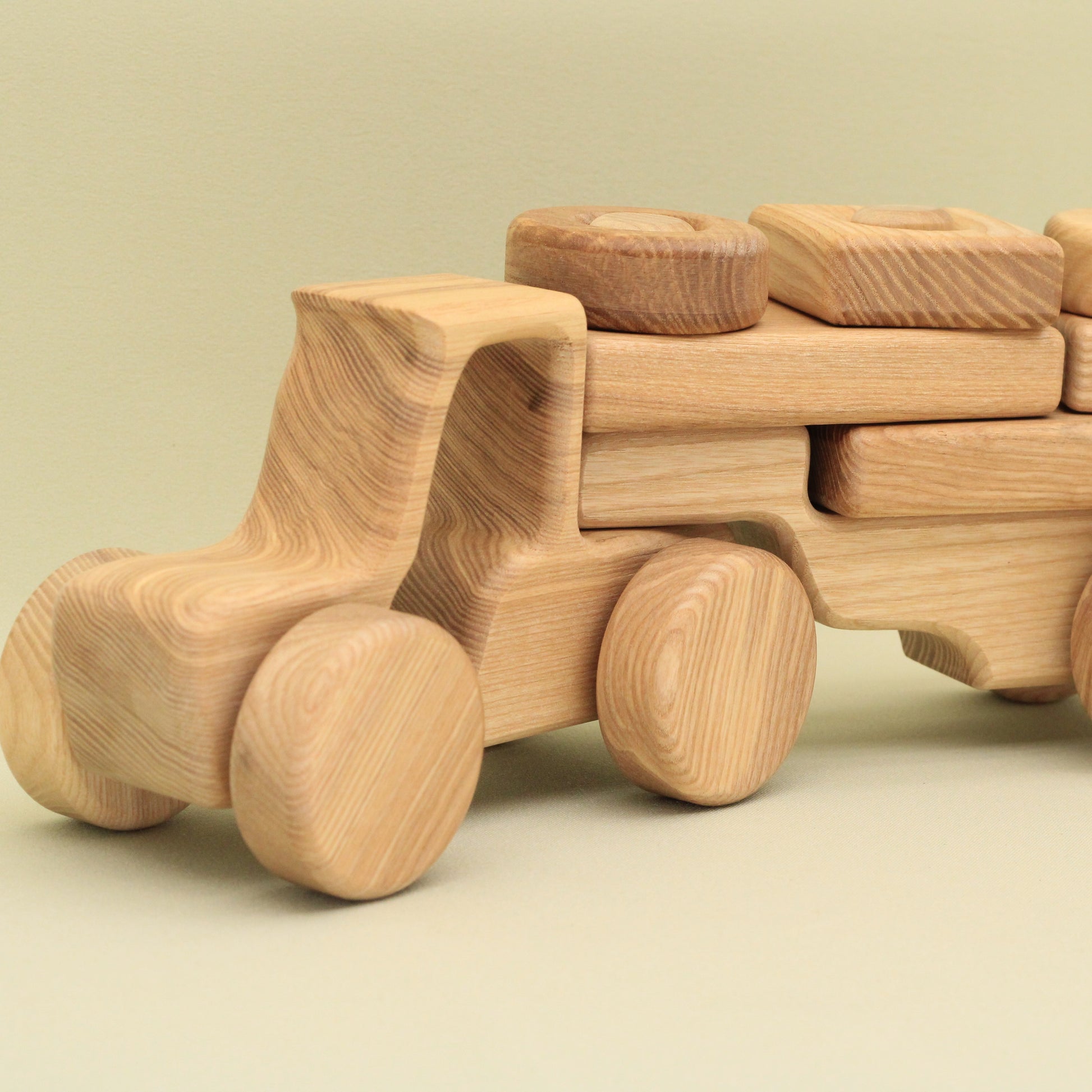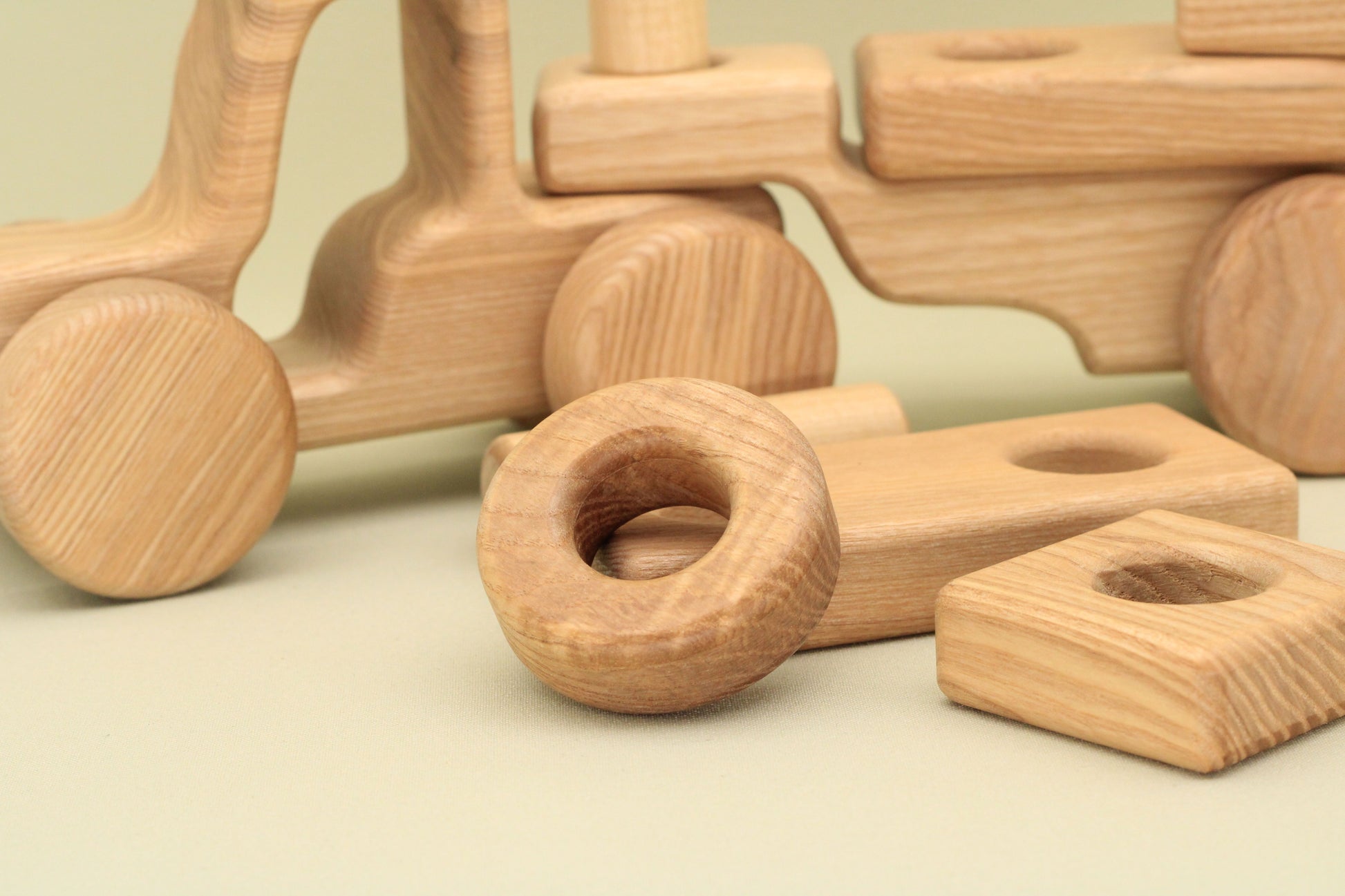 Enliven your child's world with the charm of natural, handmade wood and encourage hours of creative play. Unleash their imagination with this versatile and educational toy. Order your Wooden Stacking and Building Tractor Constructor with Trailer today and watch as they embark on a journey of endless fun and learning.